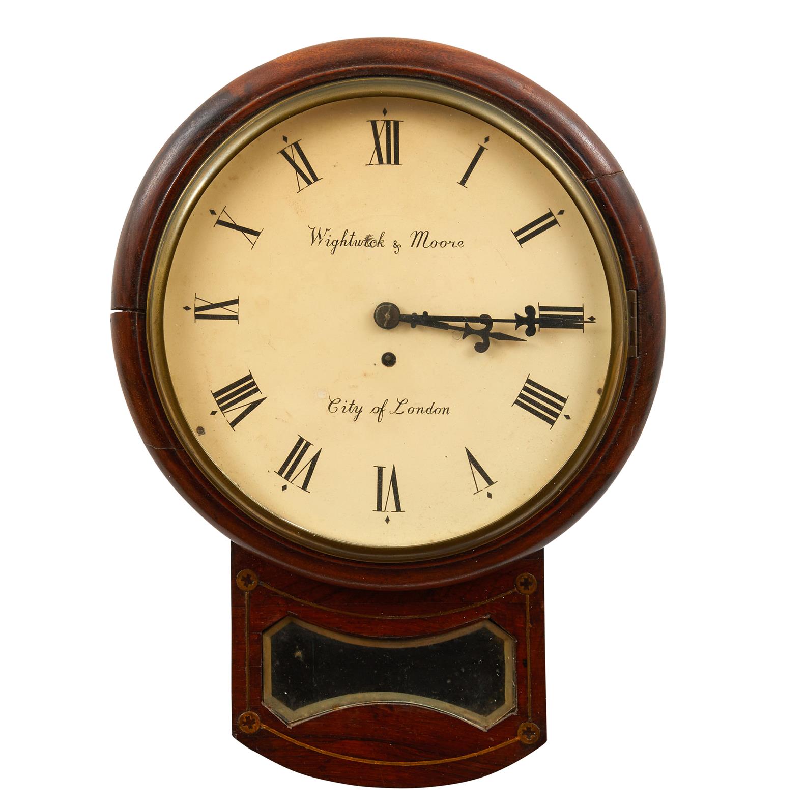 The painted dial with Roman numerals by Wightwick & Moore, City of London, with brass bezel, the pendulum in glazed case with brass inlay.