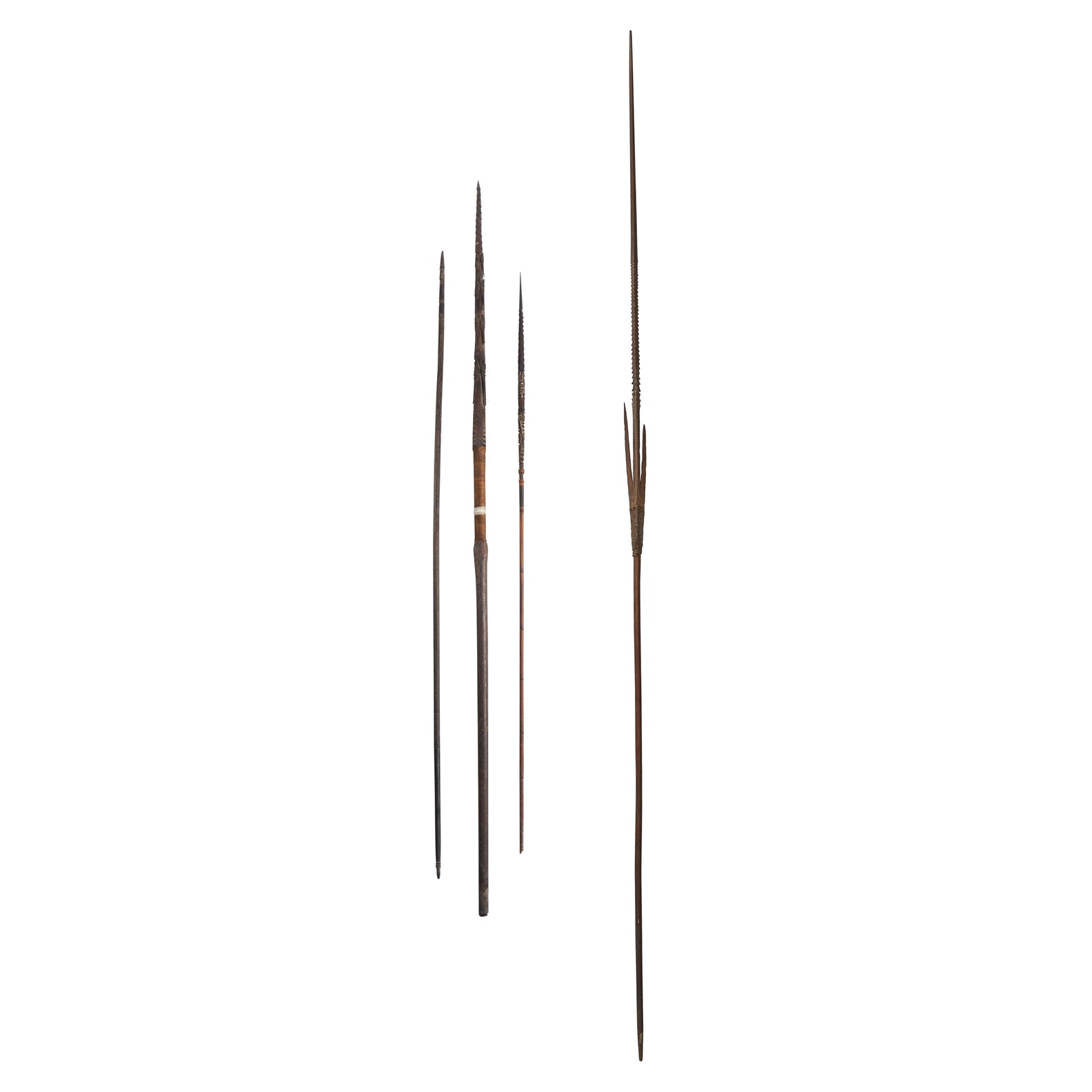 One spear stone-carved with three prominent barbs encircling the central haft of the section incorporating the point; and another spear and two New Guinea arrows (4).
