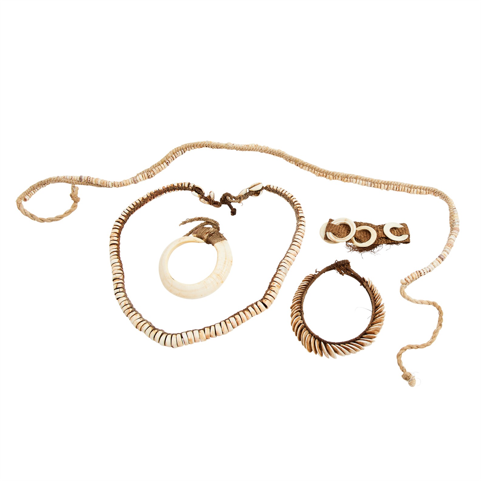 Including a finely made necklet of conus shell discs of graduating diameter; two large necklaces of shell discs and a finely formed boars tusk pendant (5).