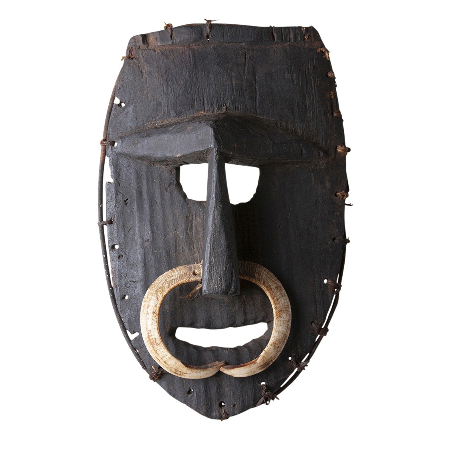 With a much-used blackened patina, fibre attachments around the edges and boar tusks inserted through the septum.