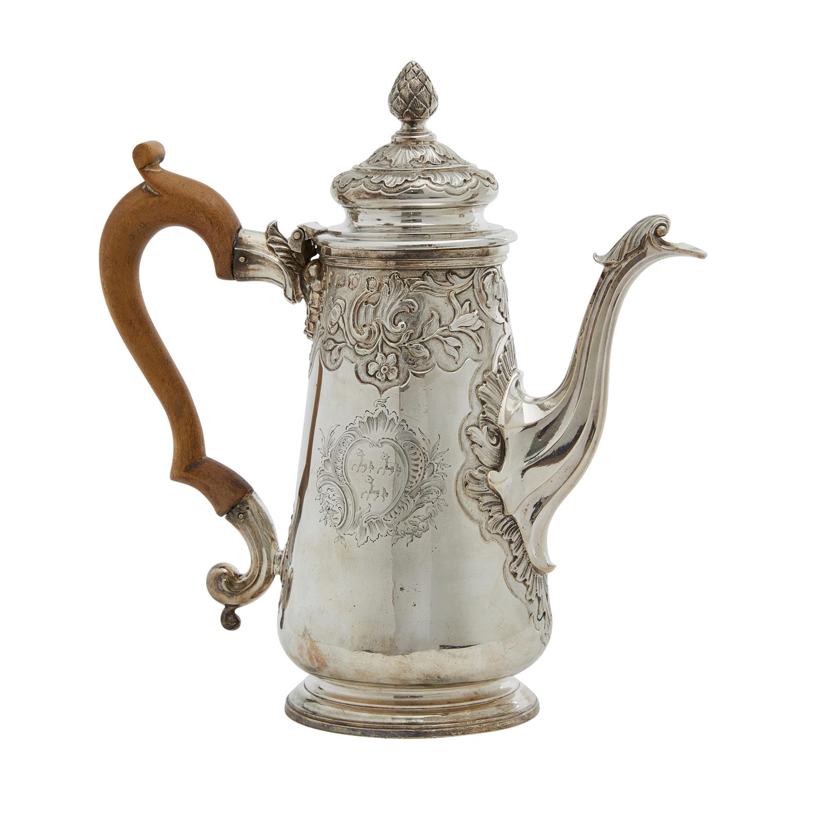 Maker's mark of James Shruder, London 1749, the hinged cover with artichoke finial and richly cast with rocaille, the pear-shaped body cast with flowers and rocaille and engraved with a coat of arms on a moulded foot, with shaped boxwood handle.