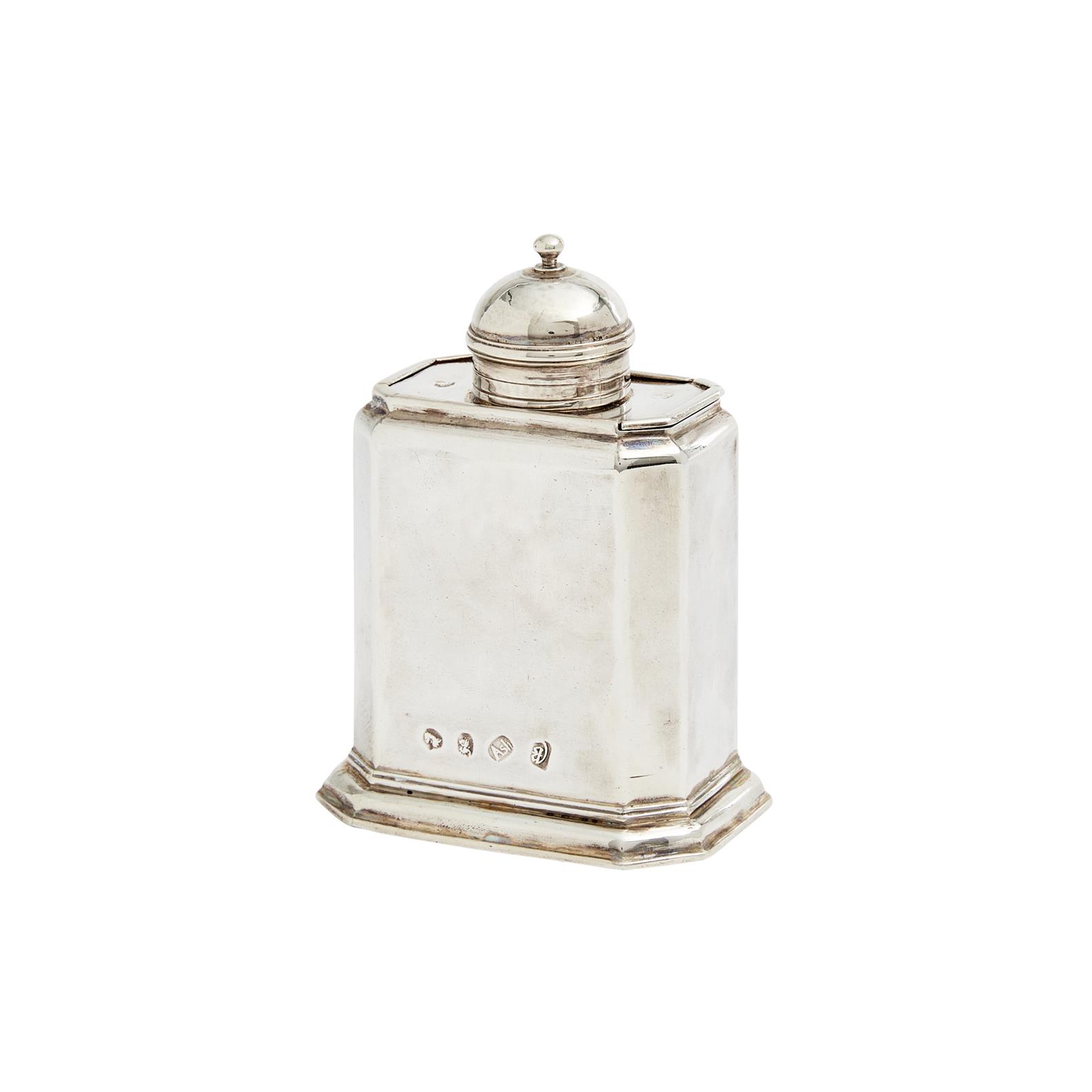 Maker's mark of Thomas Ash, London 1712, the rectangular body with chamfered corners on moulded foot, the sliding cover with domed finial, the underside engraved with initials V / L.E.