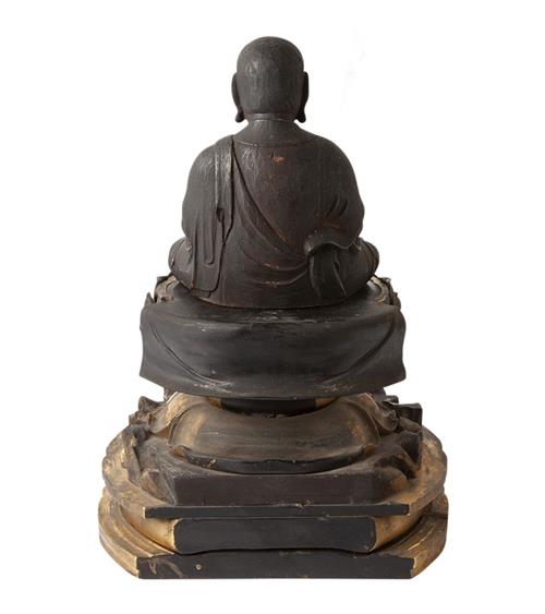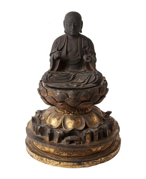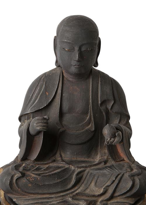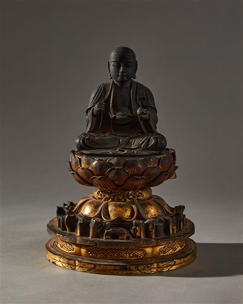 Muromachi/Momoyama period, late 16th century, shown in the guise of a serene monk with shaved head, his right hand previously carrying Shakujo (staff) now lacking, and in his left a Tama or Buddhist jewel, seated on a gold lacquered lotus pedestal (later Edo addition c.1800).
