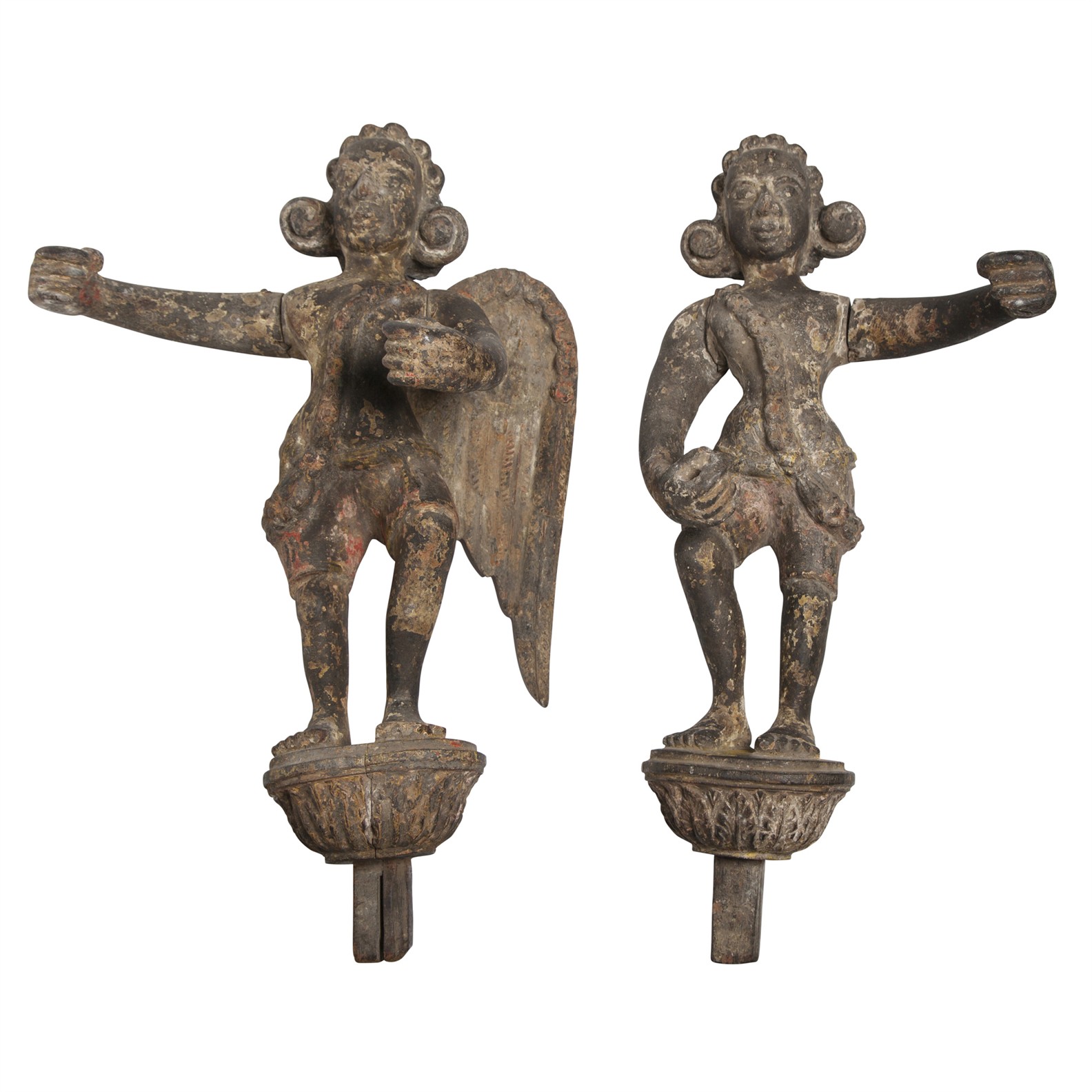 16th century, each with one outstretched arm originally holding a candle (?) one missing both wings, the other one wing, polychrome decoration over gesso.