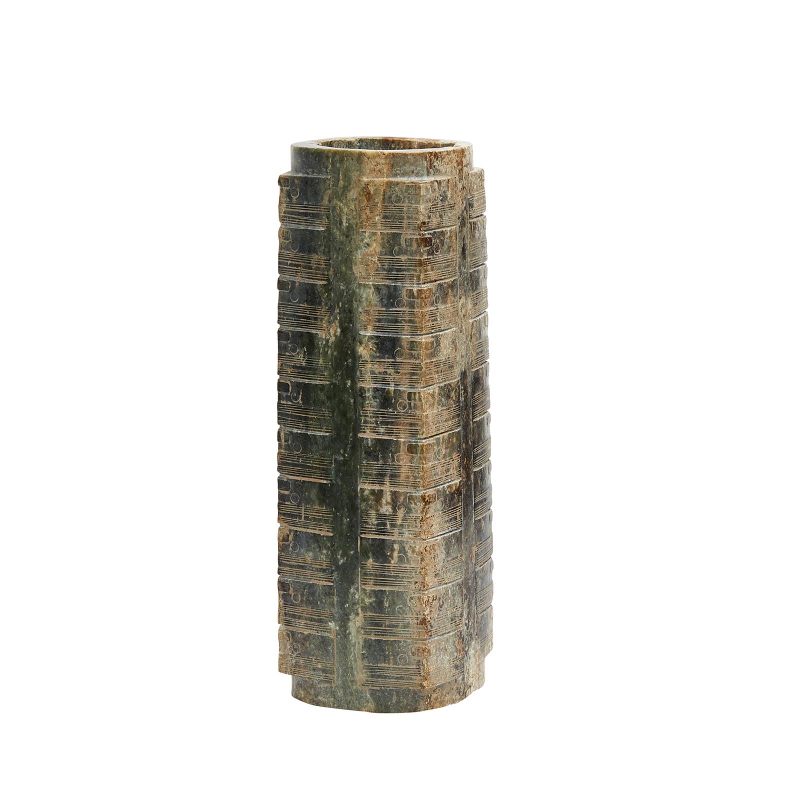 Possibly Neolithic, cylindrical form with incised linear and mask motifs.