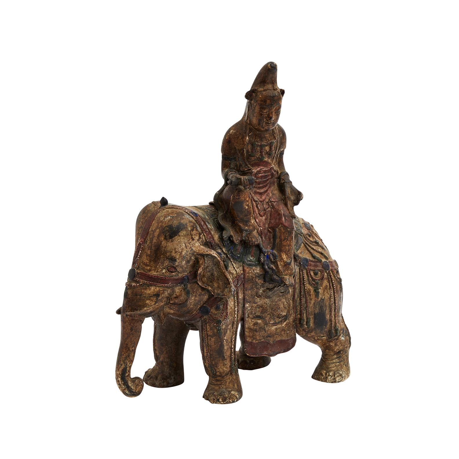 18th century, in the form of an elephant, with raised and painted vestments and jewellery, the figure of Kuan Yin (?) seated and forming a lid to the vessel.