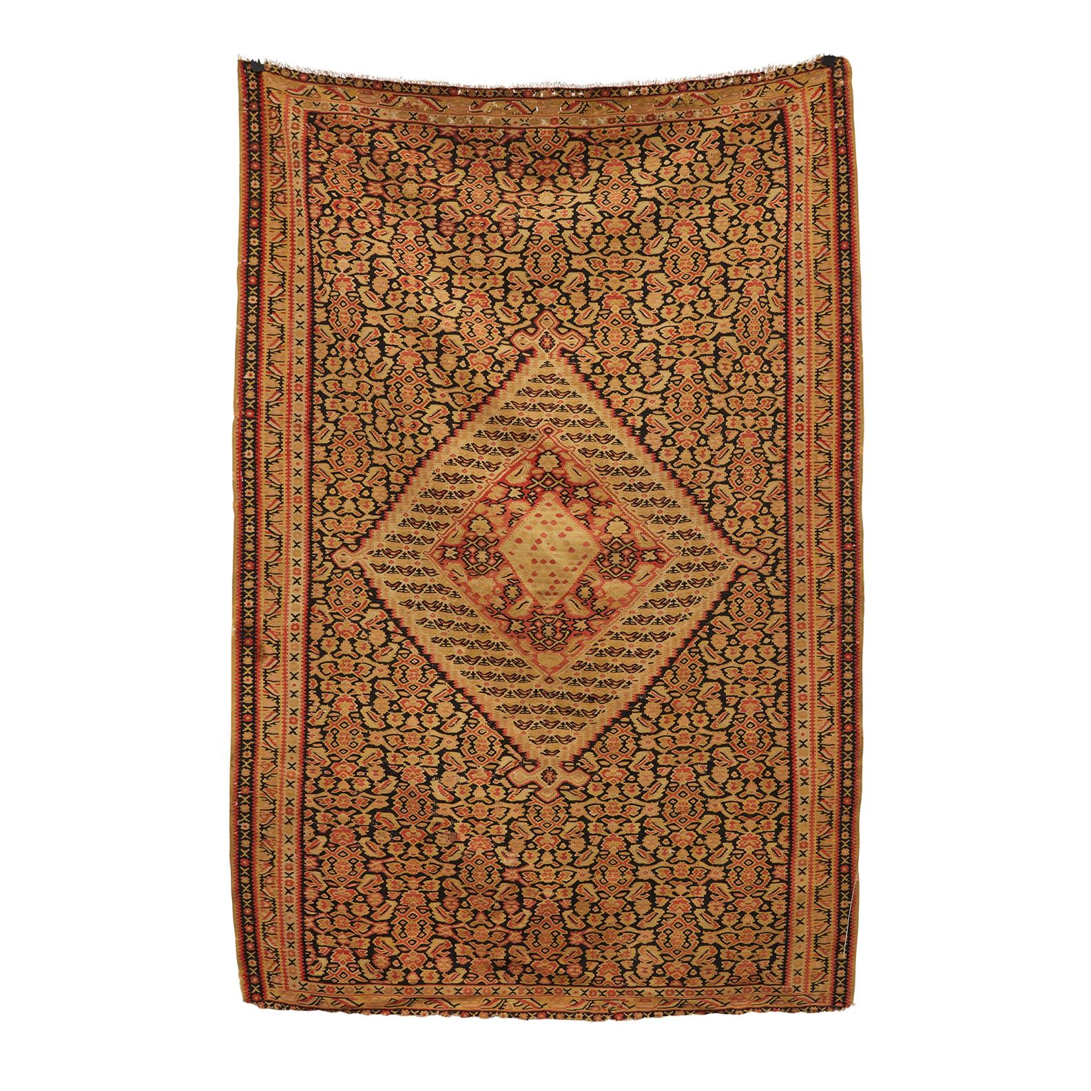 Overall slight wear consistent with age and use. A small area of repair near bottom of medallion and other loose threads, and one end border is slightly more worn than the other end.