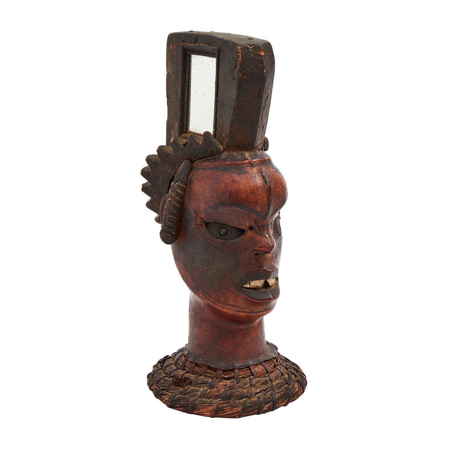 19th century, stylized female face with scarifications, a mirror inset on either side of the elaborate headgear, the whole with fine old patina consistent with age and usage.