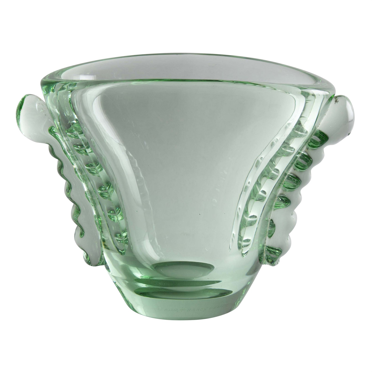 The luminous green body with ridged sections to either side of the ovoid-shaped body, incised Daum Nancy France just above the tapering foot on one side.