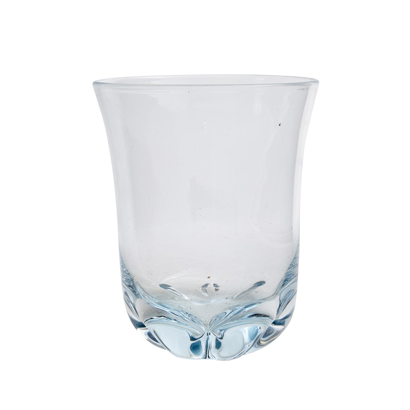 The pale blue body of circular form and with a six-lobed tapering foot, signed on the underside.