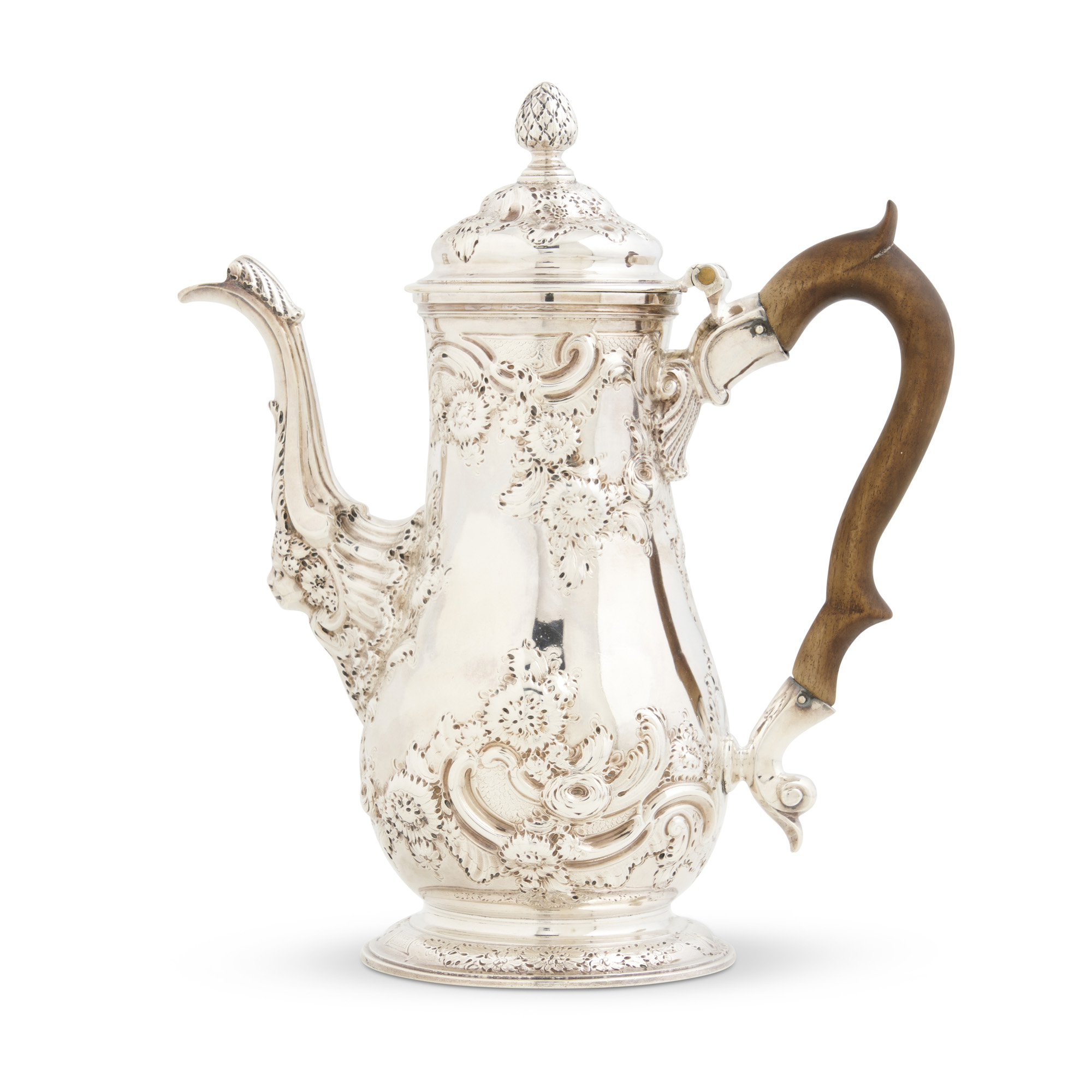 Of baluster shape with scrolling hardwood handle on a circular foot, the domed cover with cone finial, the cover, body, and foot worked in relief with flowers and foliage, and the base of the spout with the head of a man, engraved to one side with a crest of a dove