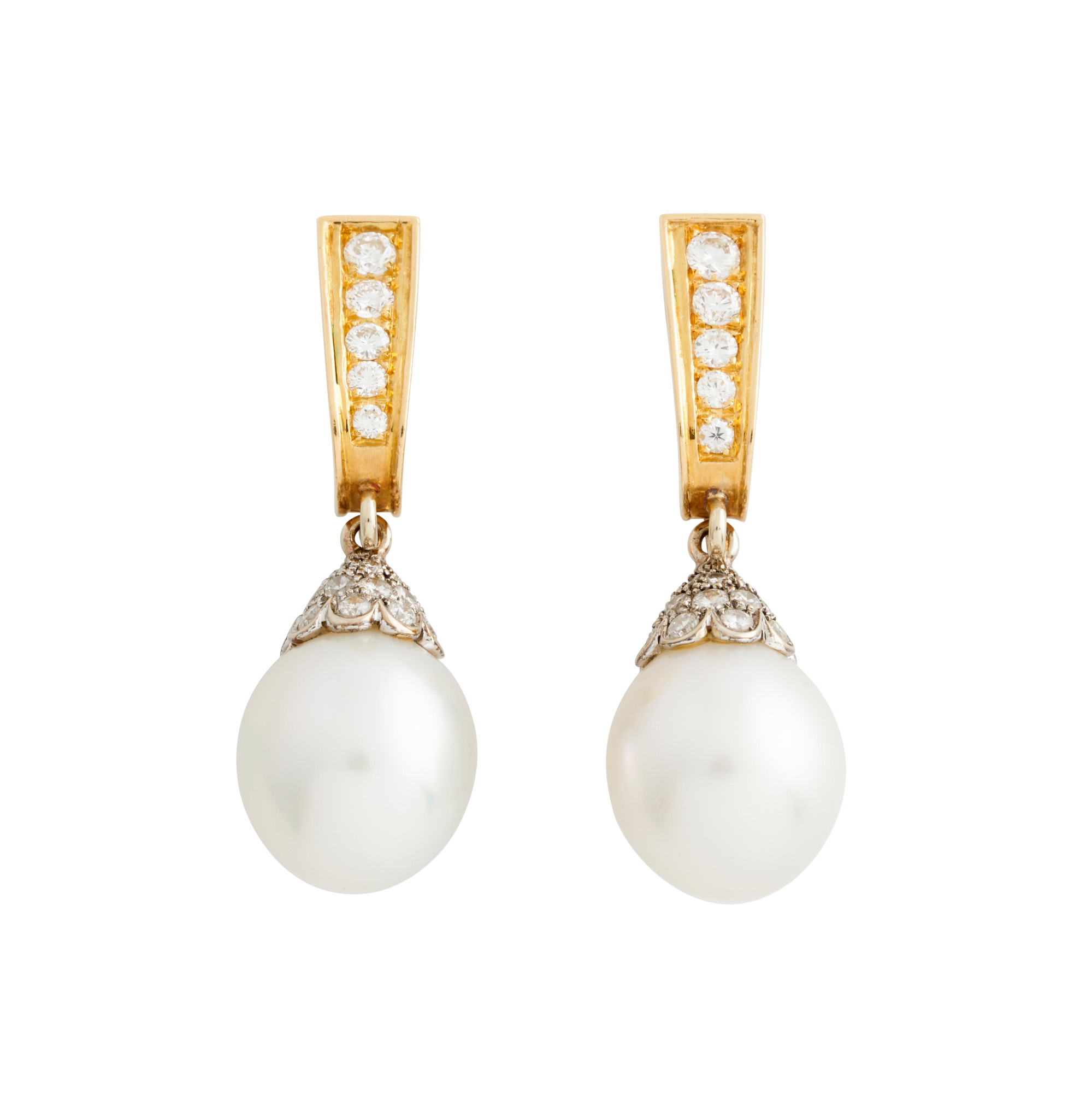 Each earring comprising a detachable drop-shaped pearl of silver white hues measuring approximately 14mm by 13.4mm, to a bell cap pavé-set with brilliant-cut diamonds, surmounted by a tapered pavé-set diamond bale, the diamonds together weighing approximately 1.21 carats, length 40mm, gross weight approximately 14.0 grams.
