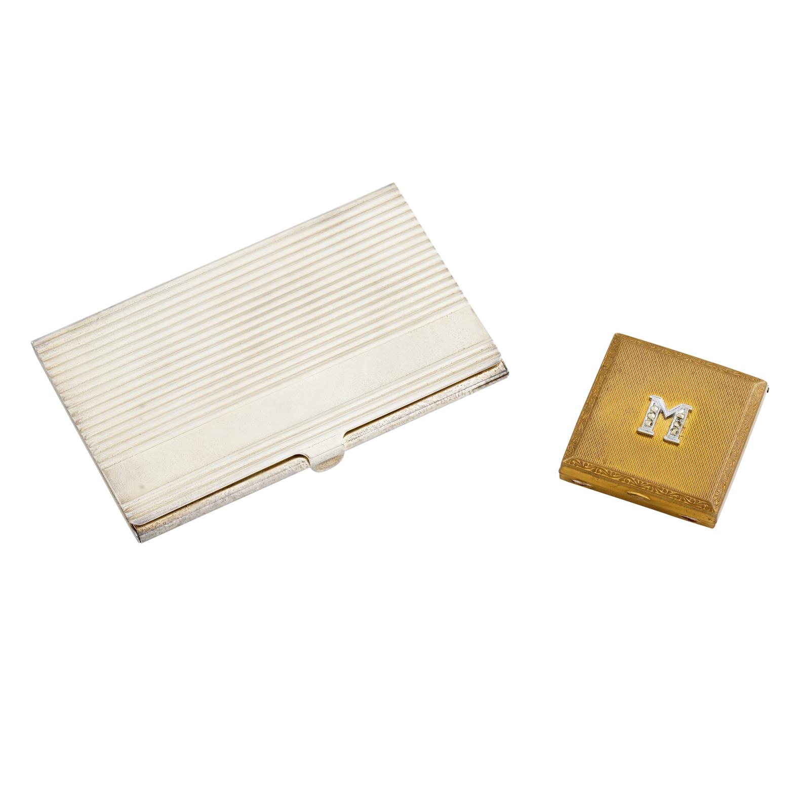 One gold tone pill box applied with a marcasite 'M', the other a card holder, both mounted in base metal and stainless steel, gross weight approximately 74.1 grams.