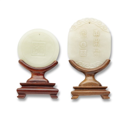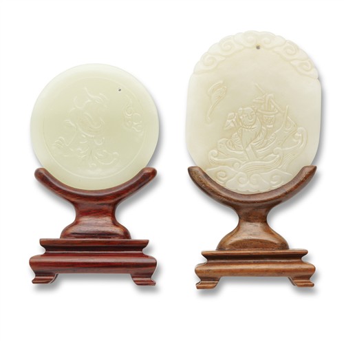 TWO CHINESE CELADON JADE CARVED ROUNDED PLAQUES, QING DYNASTY (1644 - 1911)