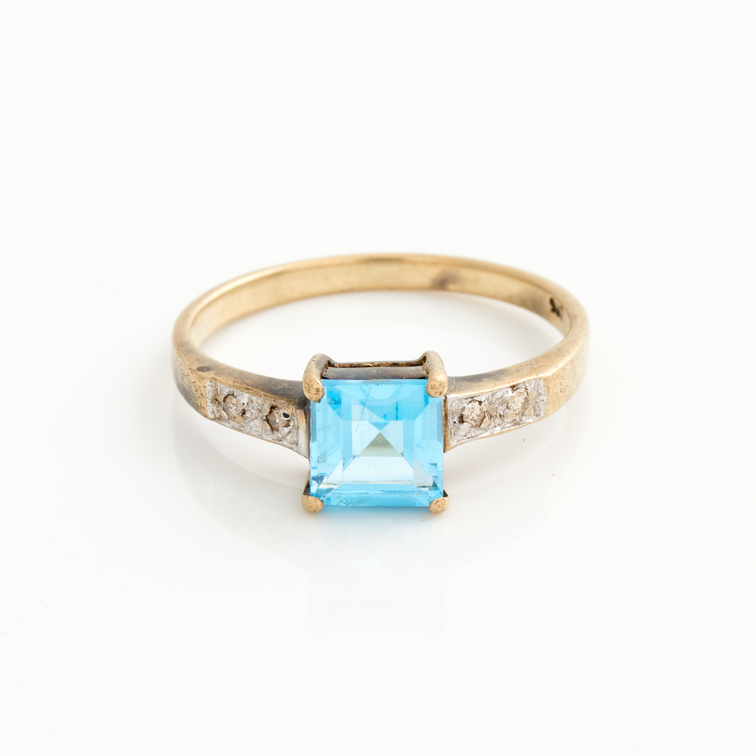 A BLUE TOPAZ AND DIAMOND RING IN 9CT GOLD, SIZE O, 1.85GMS