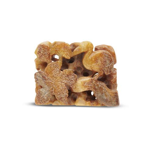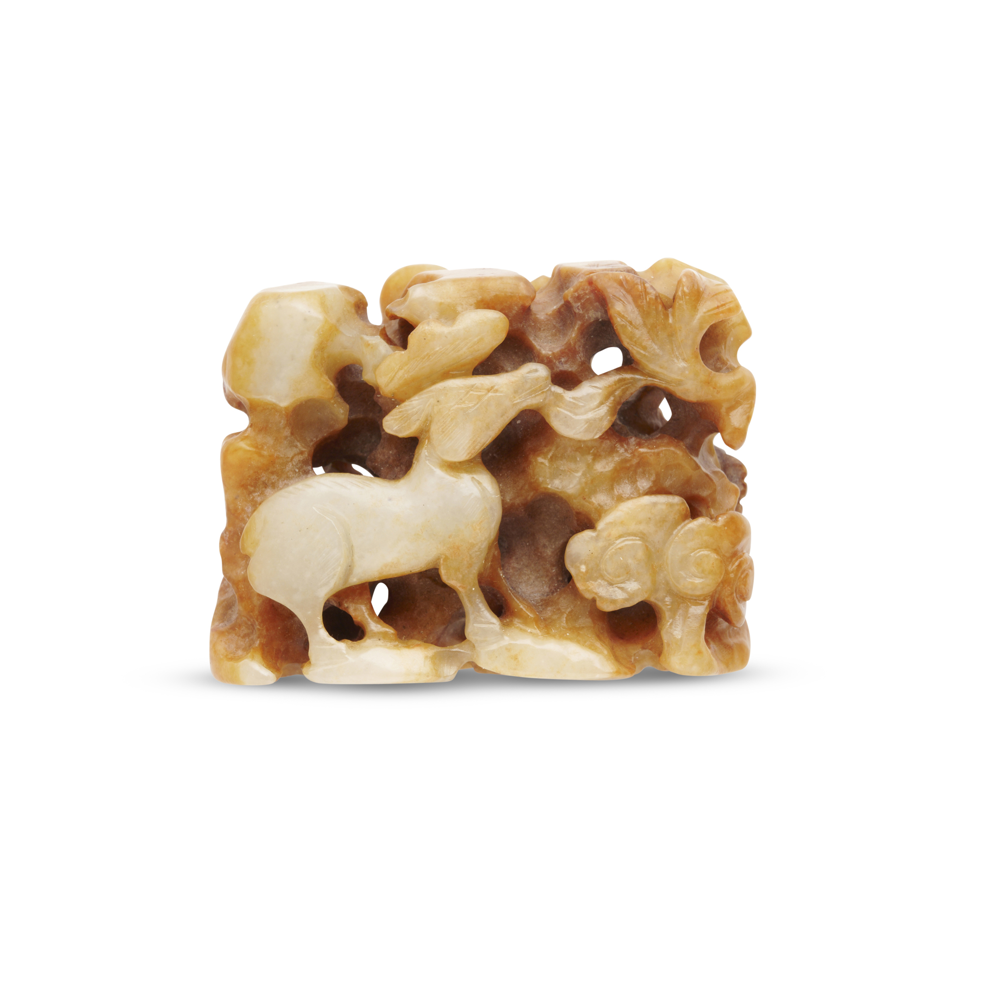 A CHINESE CELADON WHITE AND RUSSET JADE CARVED OPENWORK "SPRING WATER AND AUTUMN MOUNTAIN" FINIAL, JIN/YUAN DYNASTIES (1115-1368)