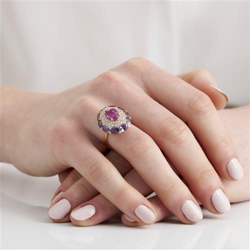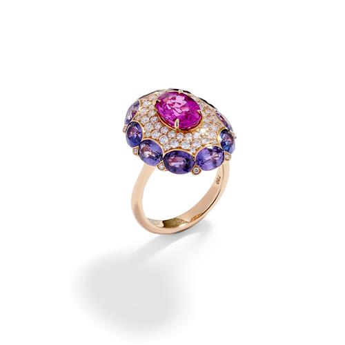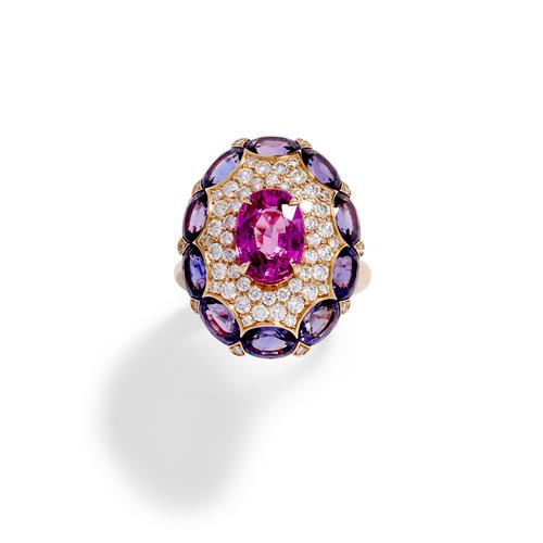 Of cluster design, centring an oval pink sapphire weighing approximately 2.72 carats, framed by a geometric surround pavé-set with brilliant-cut diamonds edged by a line of ten oval purple sapphires between a bead-set diamond accent, the purple sapphires and diamonds together weighing approximately 5.39 carats and 0.80 carats respectively, mounted in 18ct gold.
