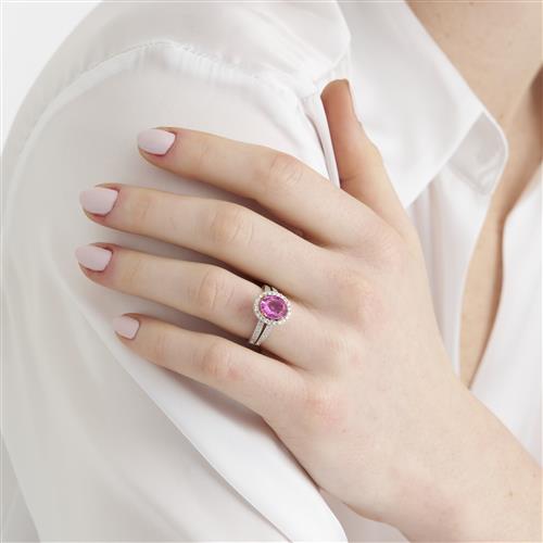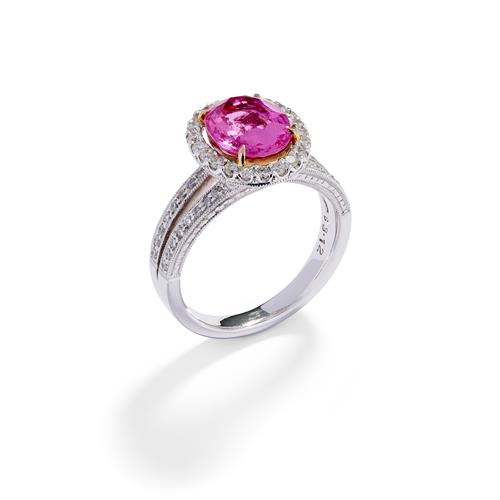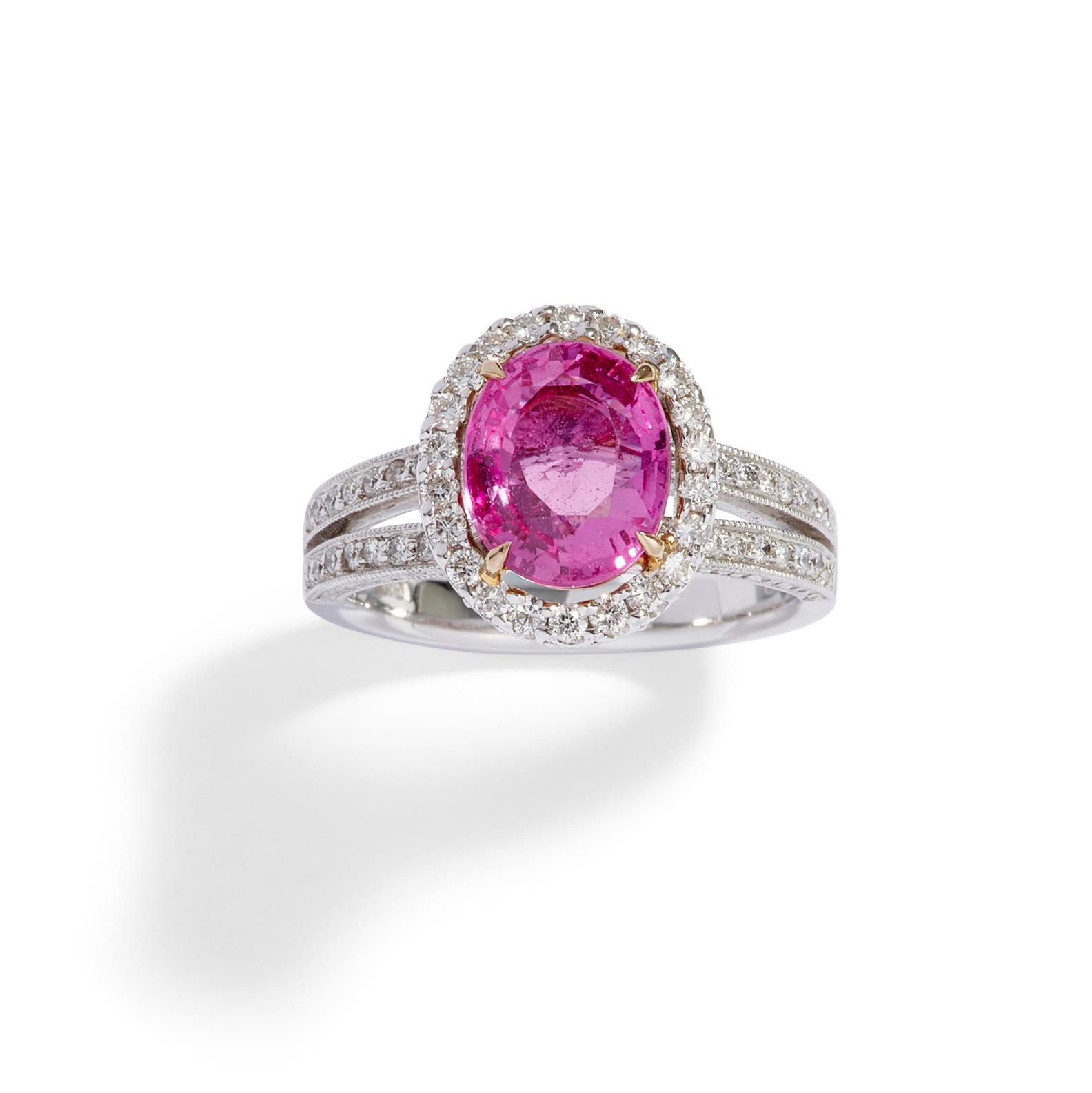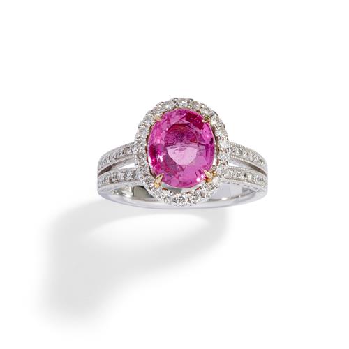 Of cluster design, centring a pink sapphire weighing approximately 3.12 carats, framed by a halo of brilliant-cut diamonds to pavé-set split shoulders, the small diamonds together weighing approximately 0.49 carats, mounted in 18ct white gold.