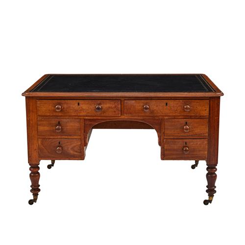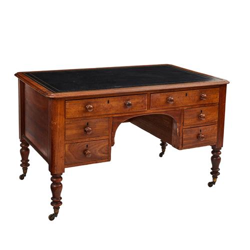 The leather lined top above two long and four short drawers around an arched kneehole on baluster turned legs with castors.