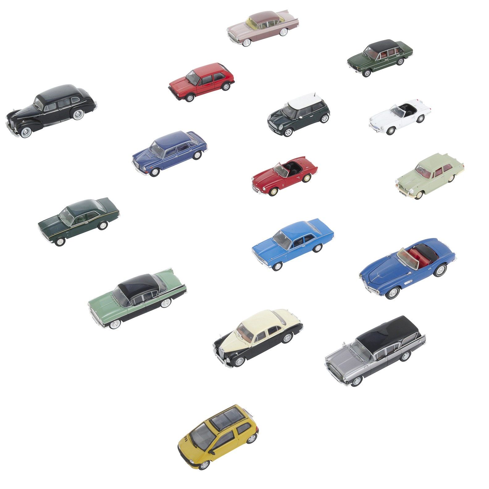 A COLLECTION OF SIXTEEN DIECAST MODEL CARS BY VARIOUS MAKERS INCLUDING VANGUARDS AND OXFORD. MODELS INCLUDE TRIUMPH DOLOMITE, TRIUMPH HERALD AND VAUXHALL CRESTA