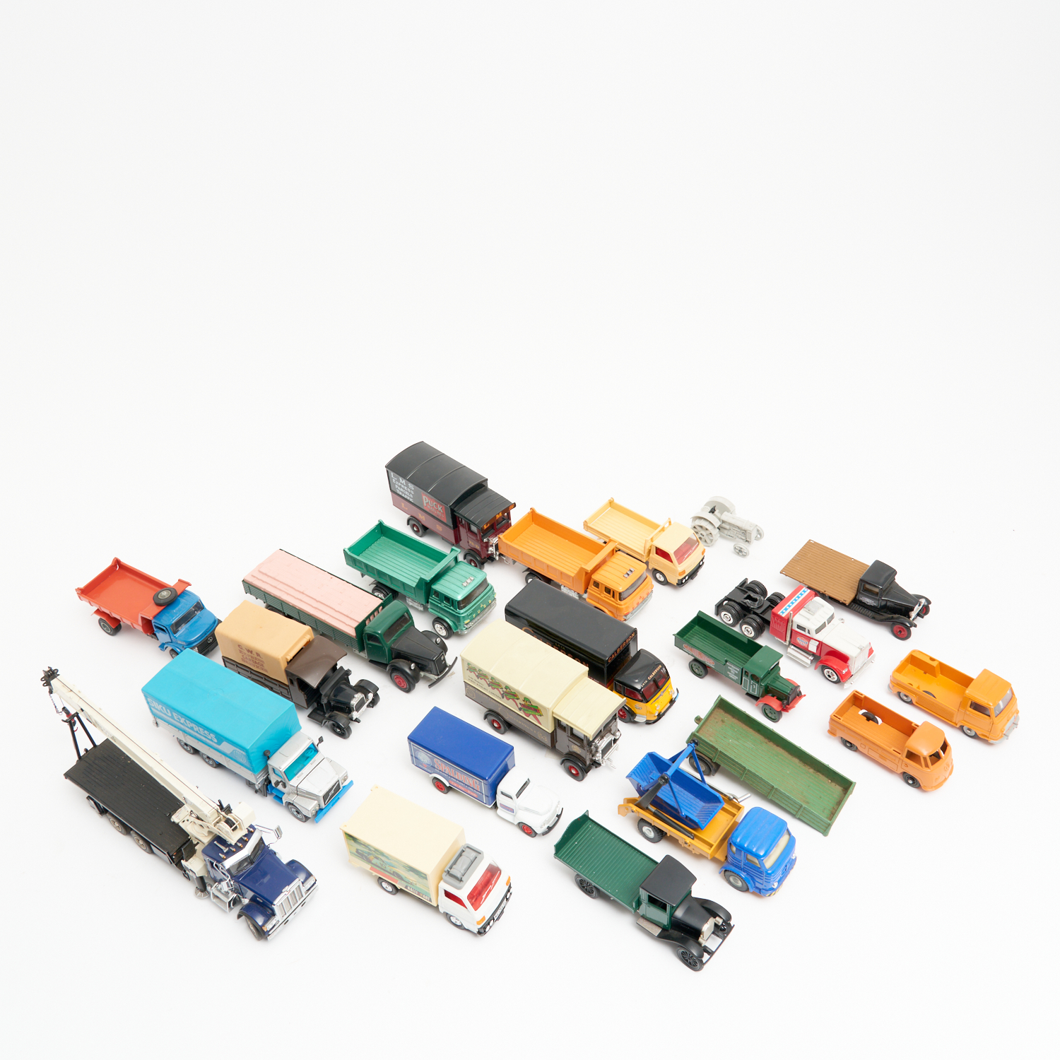 A COLLECTION OF DIECAST MODEL TRUCKS BY VARIOUS MAKERS INCLUDING TOMICA DANIDY, CONRAD AND SIKU. MODELS INCLUDE A VOLVO 12 TURBO 8, 1930 CHEVROLET AND MITSUBISHI RUSO DUMP TRUCK, L.27CM (LONGEST)