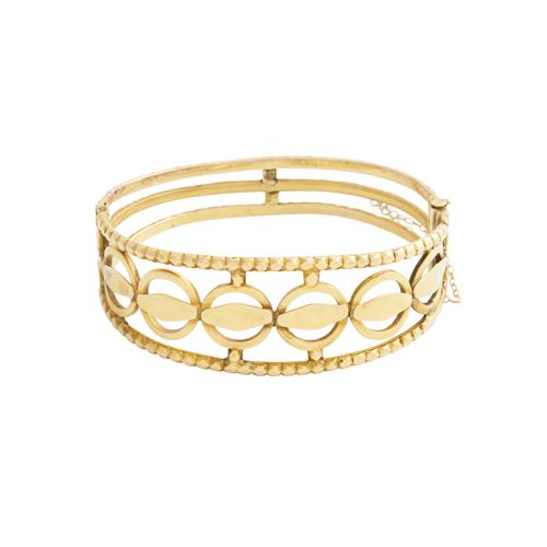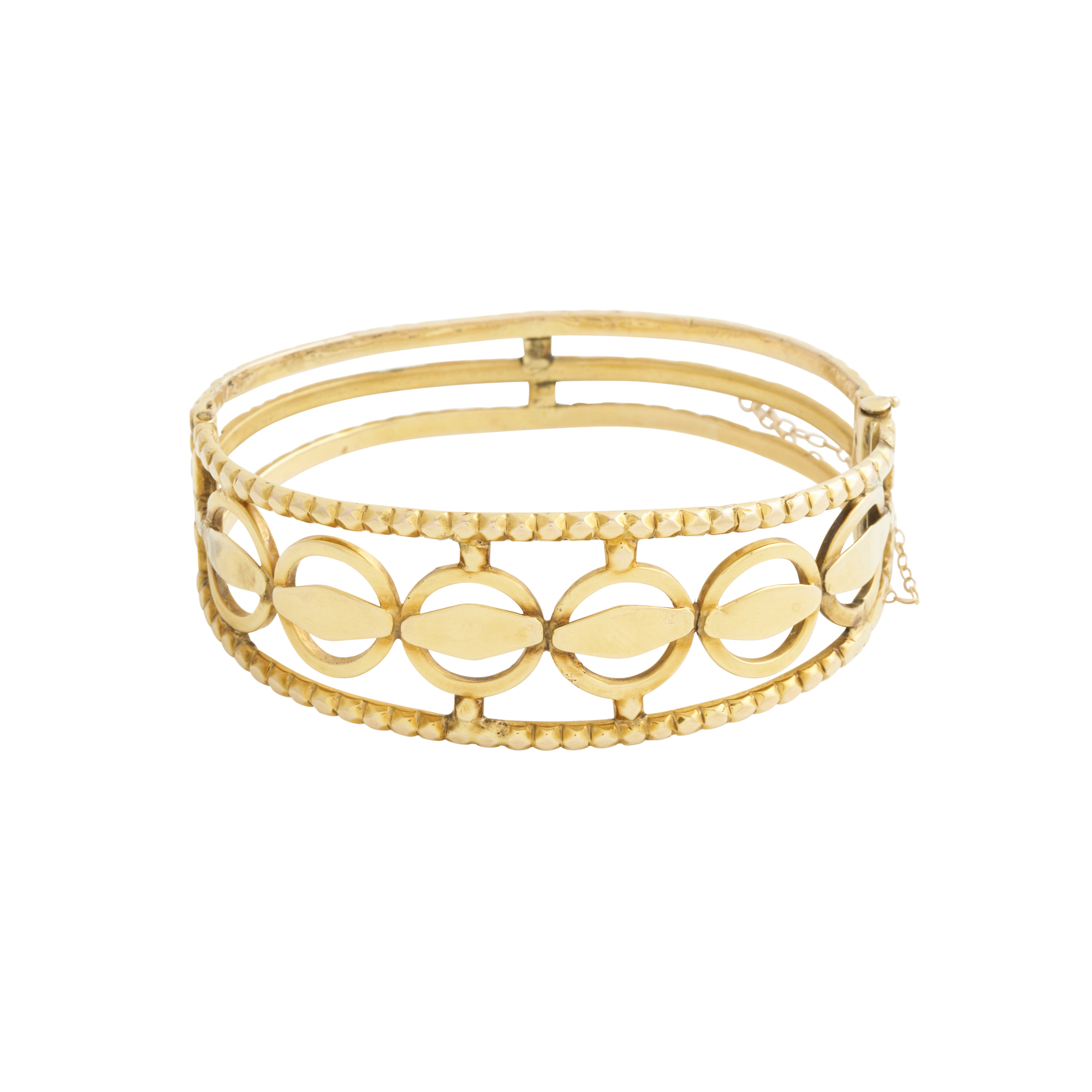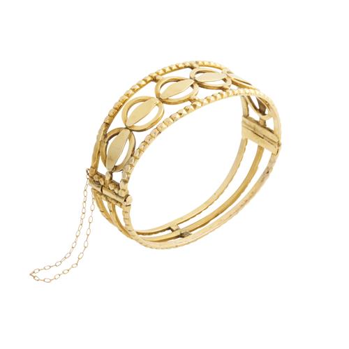 The oval hinged bangle, the top detailed with circular openwork motifs, completed by a pin clasp, inner circumference 180mm, gross weight approximately 35.4 grams.