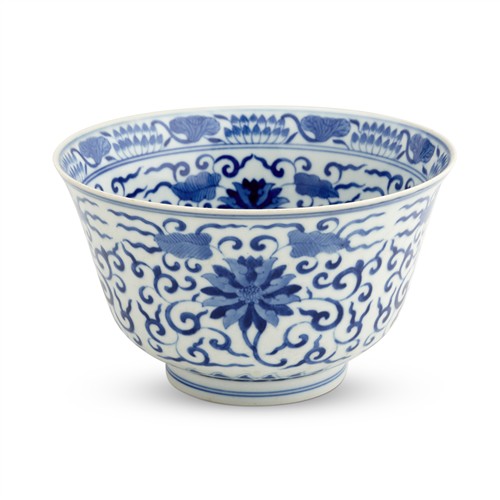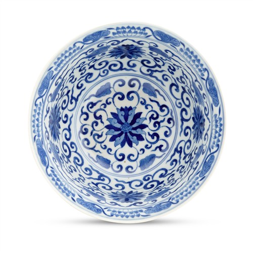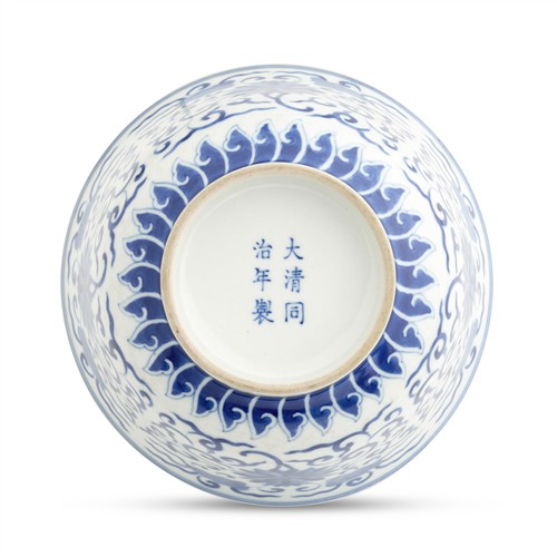 A FINE AND LARGE CHINESE BLUE AND WHITE "FLORAL" BOWL, TONGZHI SIX-CHARACTER MARK IN UNDERGLAZE BLUE AND OF THE PERIOD (1862-1874)