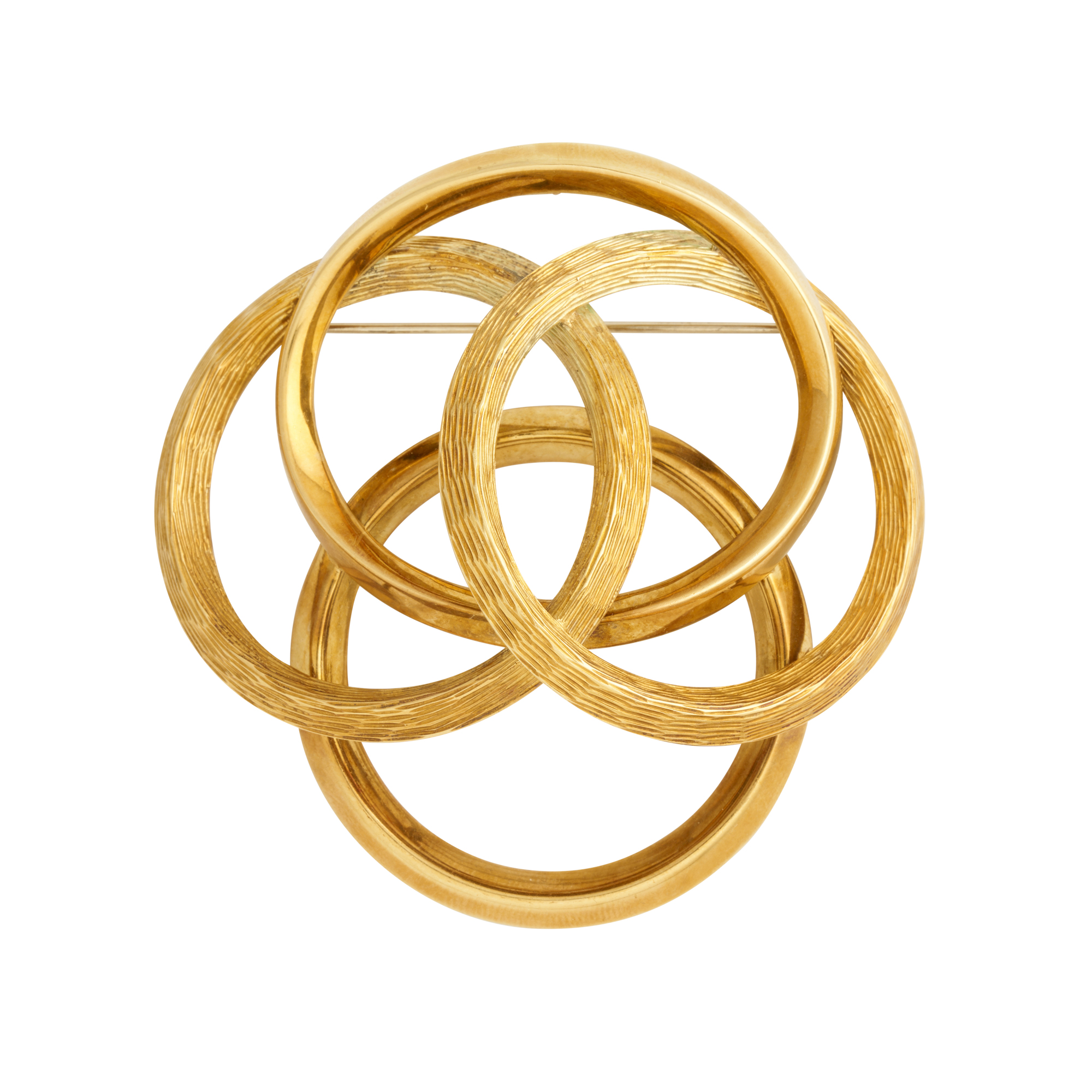 Modelled as four large interlocking textured and polished rings, length 72mm, width 72mm, gross weight approximately 28.7 grams.