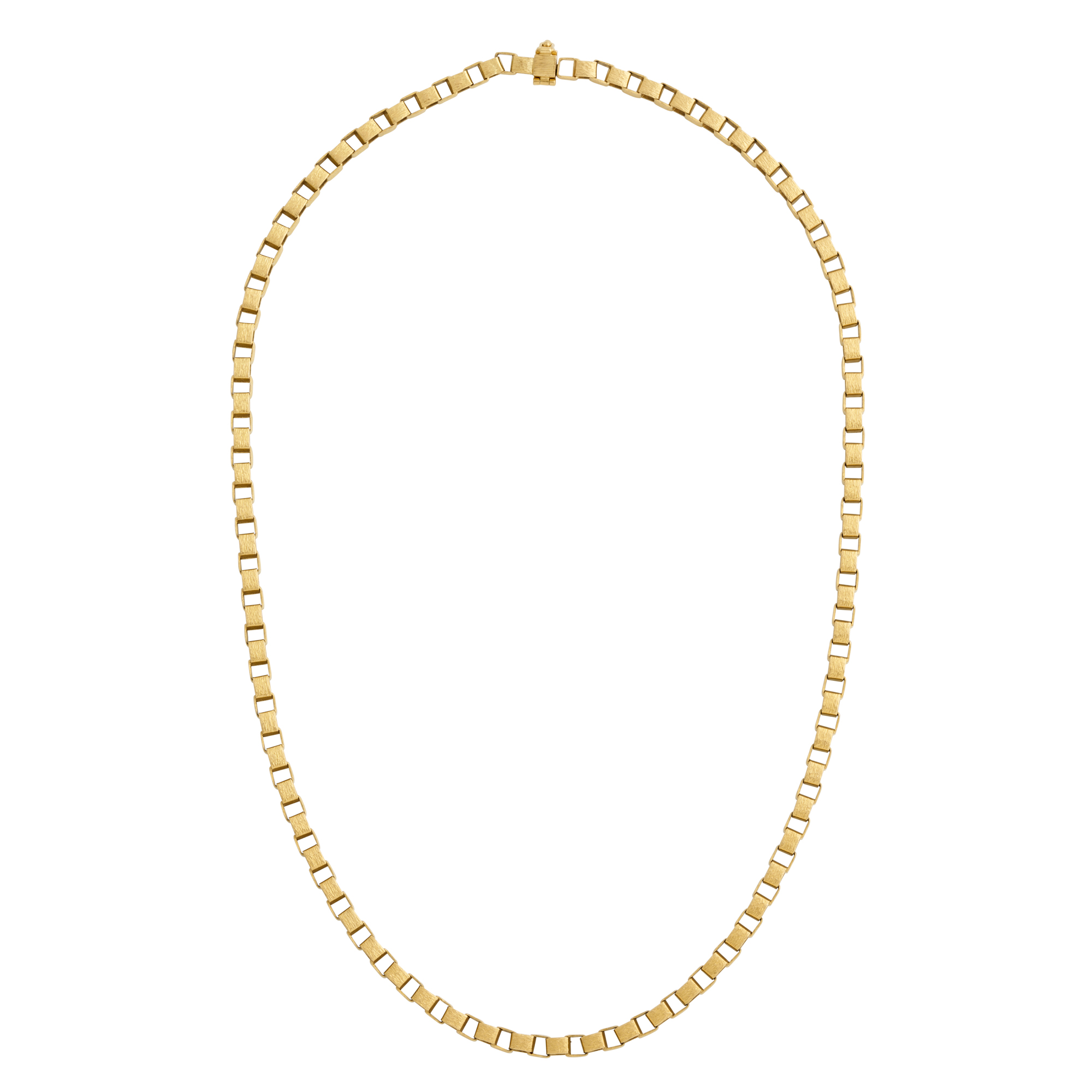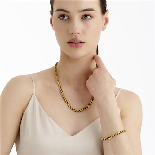 Comprising a necklace and bracelet modelled from textured box links, each with snap lock clasps allowing them to be worn both individually and joined, bracelet length 220mm, necklace length 550mm, gross weight approximately 74.7 grams.