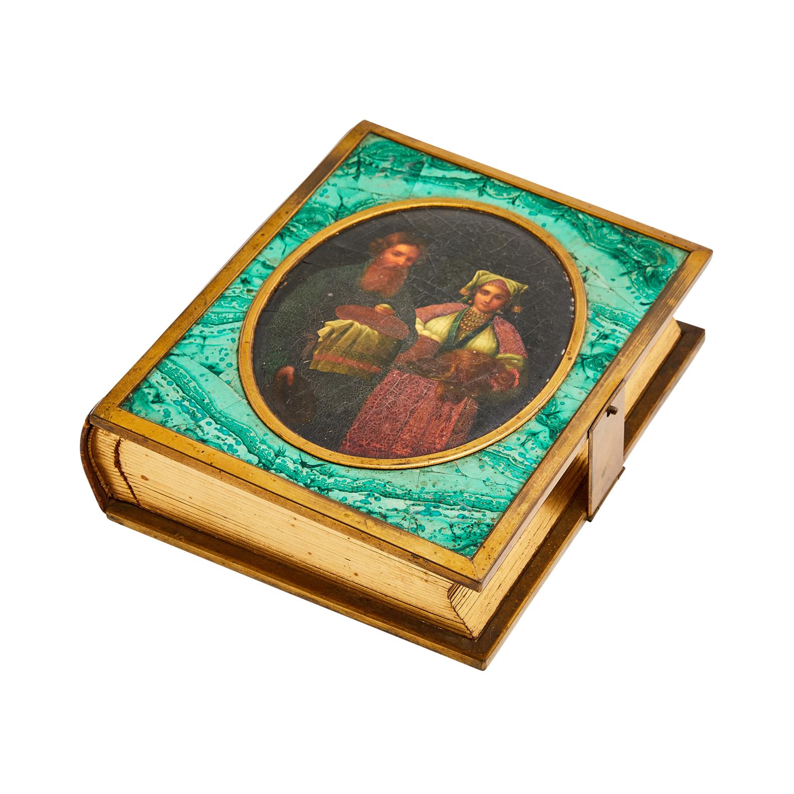 The plaque second half 19th century with an oval panel of a peasant couple offering bread and salt, and produce, the leather binding mounted in malachite and giltmetal.