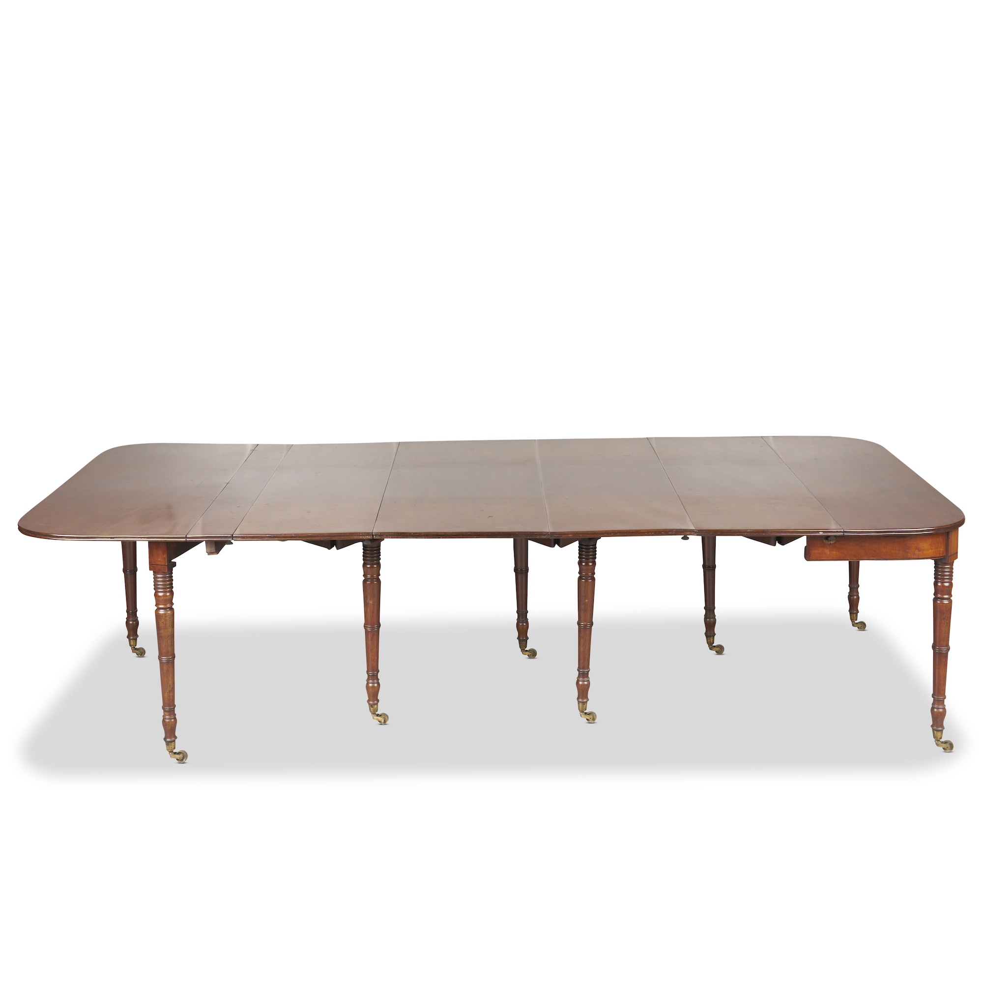 The rounded rectangular top (with four spare leaves) extending on a concertina action, raised on tapering turned supports with brass caps and casters