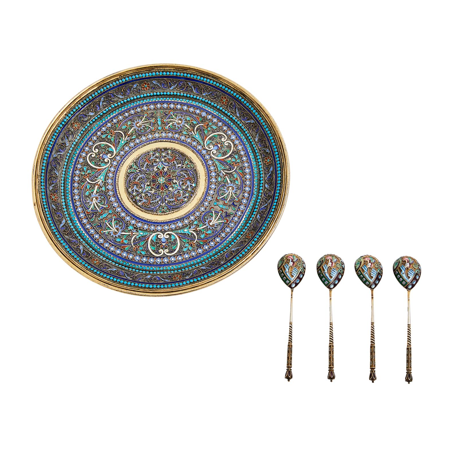 The tray with mark of Ivan Saltykov, Moscow 1889, with an overall design of stylised foliate scroll around a central flowerhead, the spoons Moscow 1908-1926 with cloisonné bowls and spiral stems.