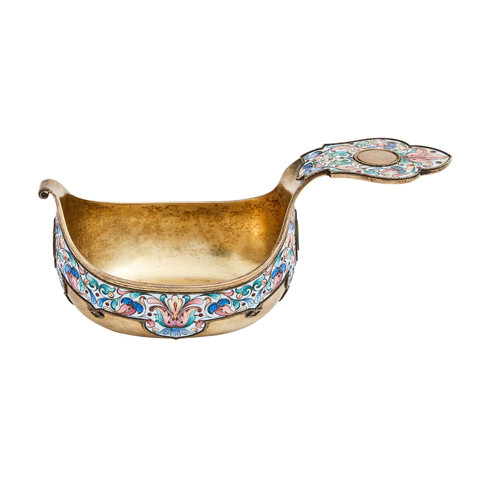 Mark of Grachev Brothers with imperial warrant, St Petersburg 1899-1904, 88 standard, of traditional form with curled prow and raised handle, the bowl enamelled with a broad border of stylised folidate scrolls in the Old Russian style, the handle with a vacant reserve.