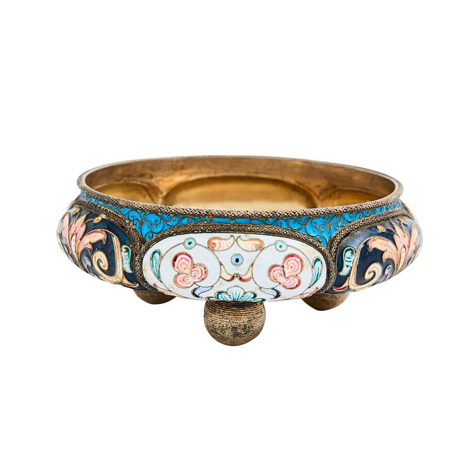 A RUSSIAN SILVER AND CLOISONNE ENAMEL CIRCULAR BON BON DISH