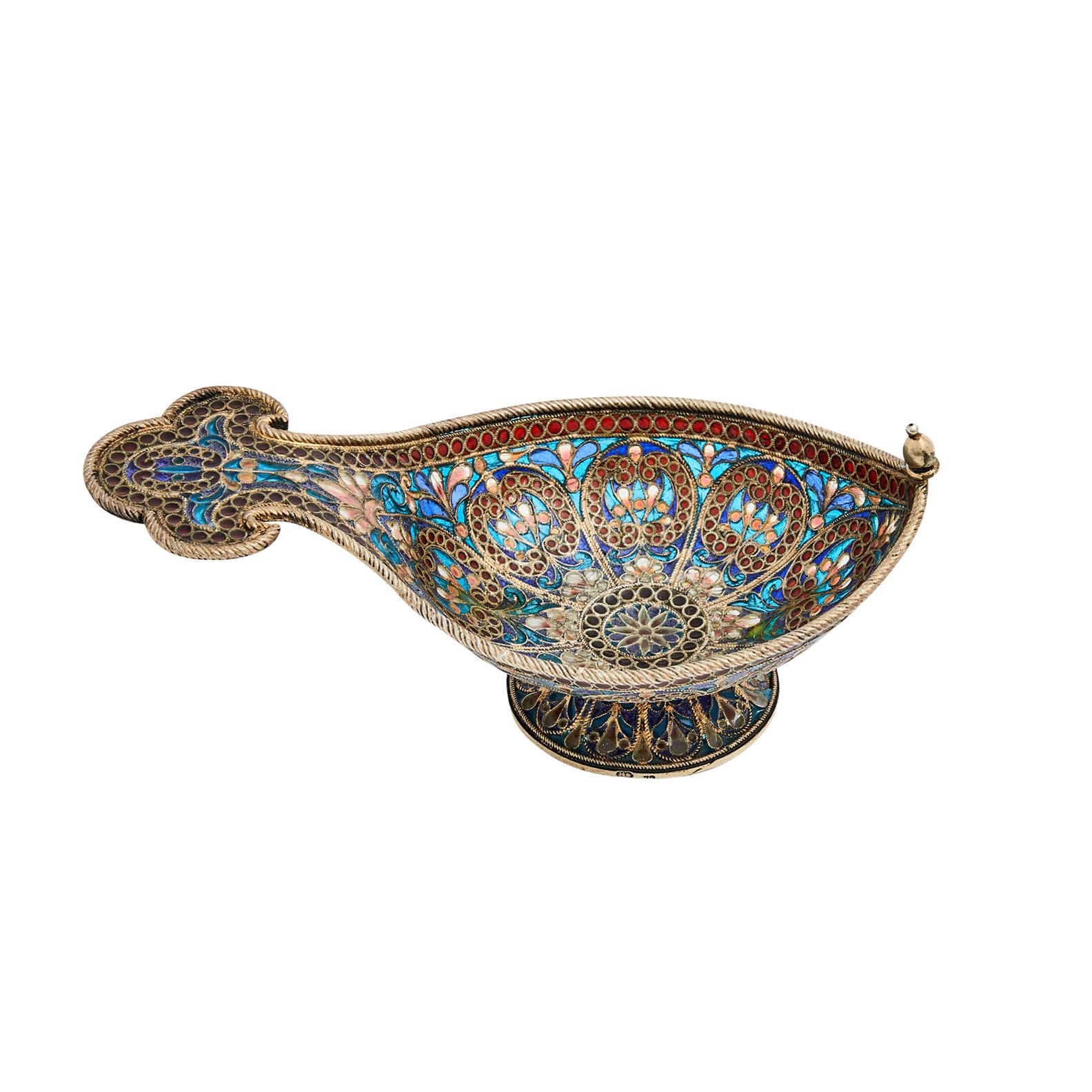 Moscow 1882-1899, maker's mark indistinct, of traditional form, with a raised prow and flat handle, plique-à-jour enamelled throughout with varicolour geometric and foliate motifs within twisted ropework borders, on a spreading foot.