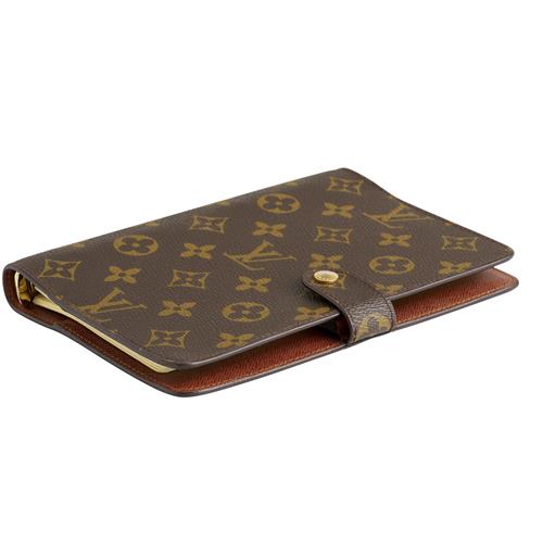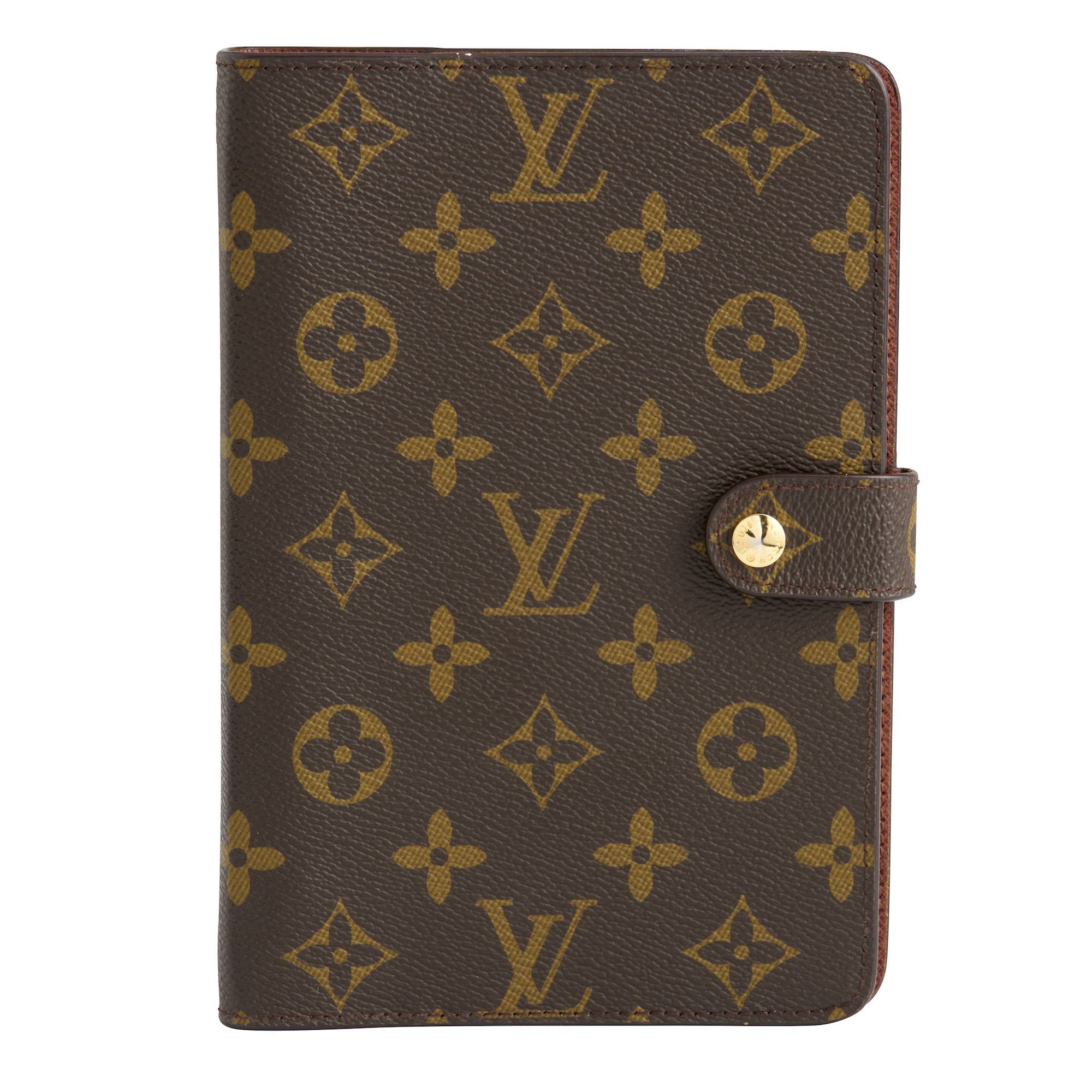 Featuring a binder styled in monogram coated canvas with gold tone hardware details and button closure, containing ruled leaflets of paper, measures 13 x 19 x 2 cm.