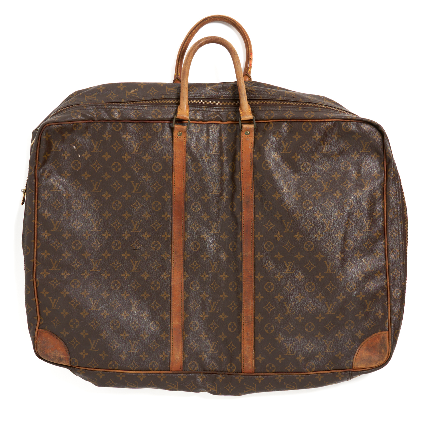 CONDITION GRADE 6: In fair condition. This piece shows significant wear and/or damage. It may require repair or refurbishment in order to be used. Significant signs of wear to exterior, leather handles and interior elements show water damage. Fabric lining of interior shows staining and wear. Leather peeling on trim. All structural elements intact.