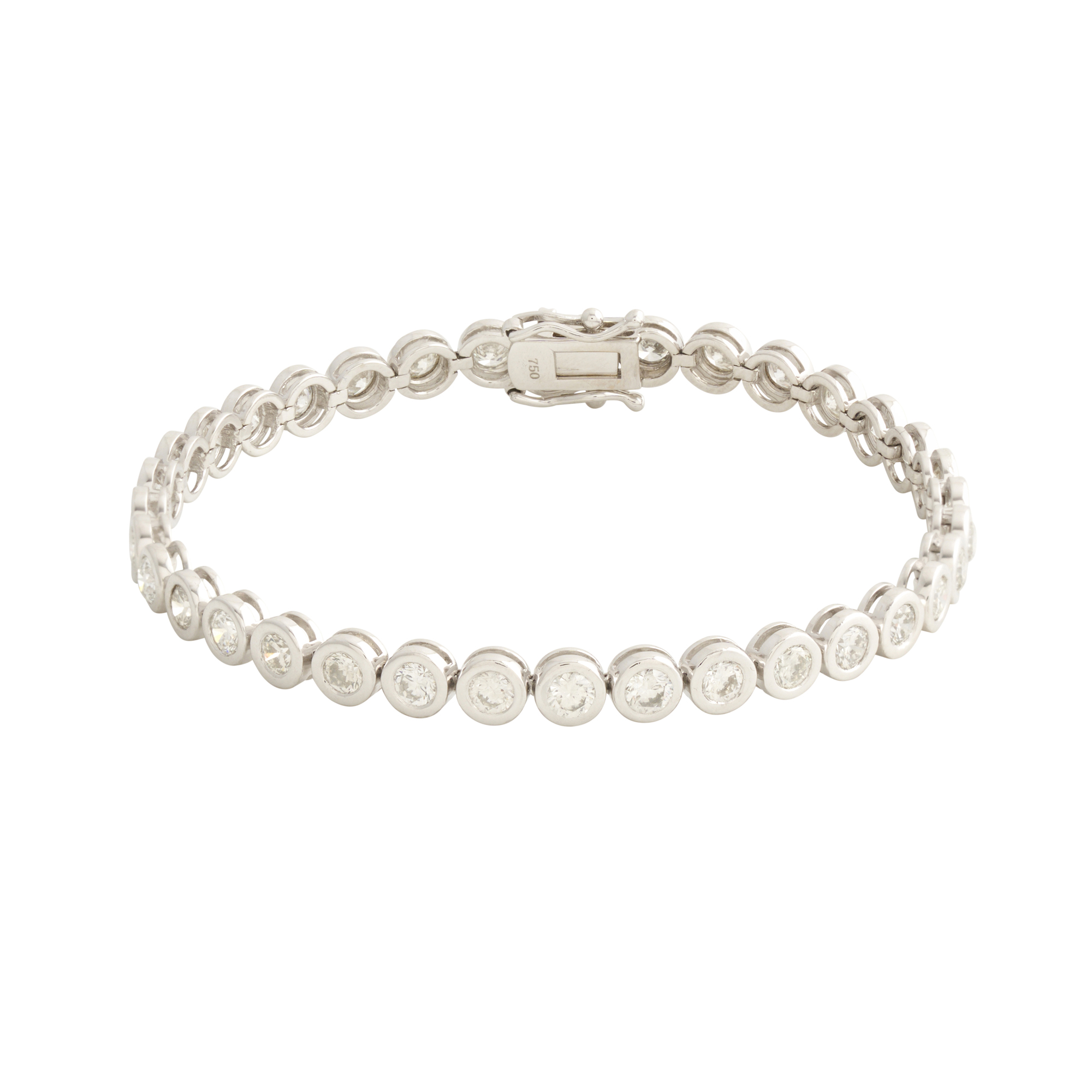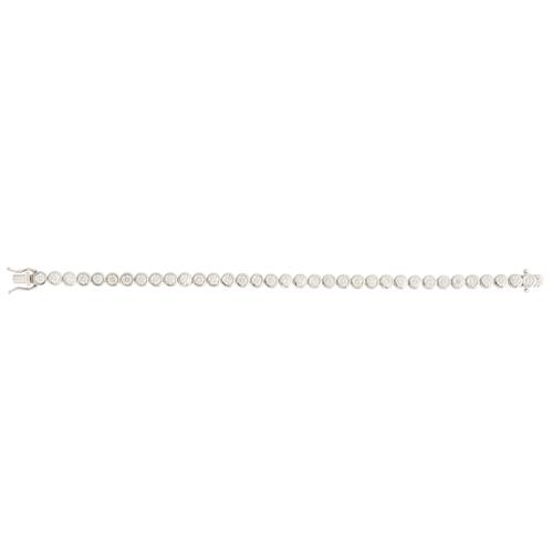 Modelled as a continuous line of thirty-five bezel-set round brilliant-cut diamonds together weighing 6.00 carats, completed by a tongue and groove clasp, length 180mm, gross weight approximately 13.6 grams.