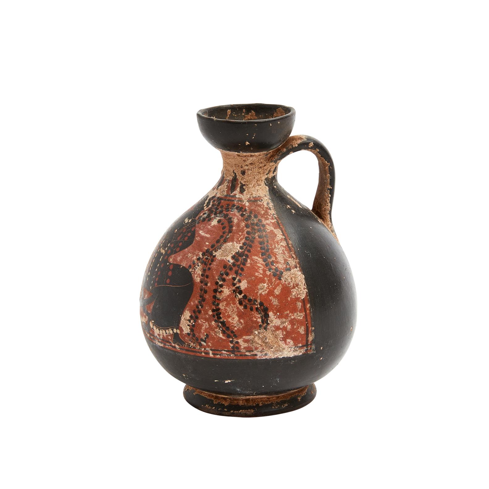 Areas of white encrustation, small pits to black slip areas, otherwise good condition.