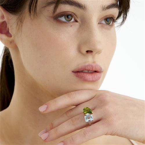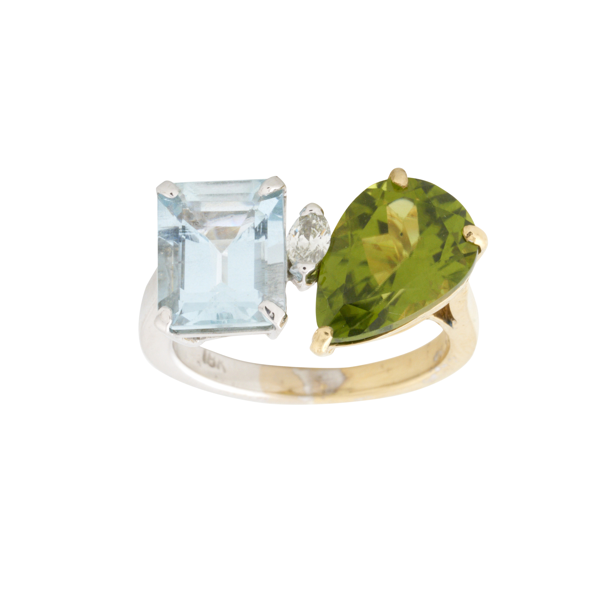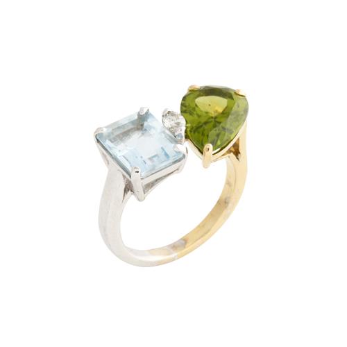 Of Toi et Moi design, centring an end-set marquise-cut diamond weighing 0.10 carats, flanked by a corner claw-set emerald-cut aquamarine weighing 3.10 carats and a claw-set pear-cut peridot weighing 4.70 carats, size O 1/2, gross weight approximately 7.4 grams.