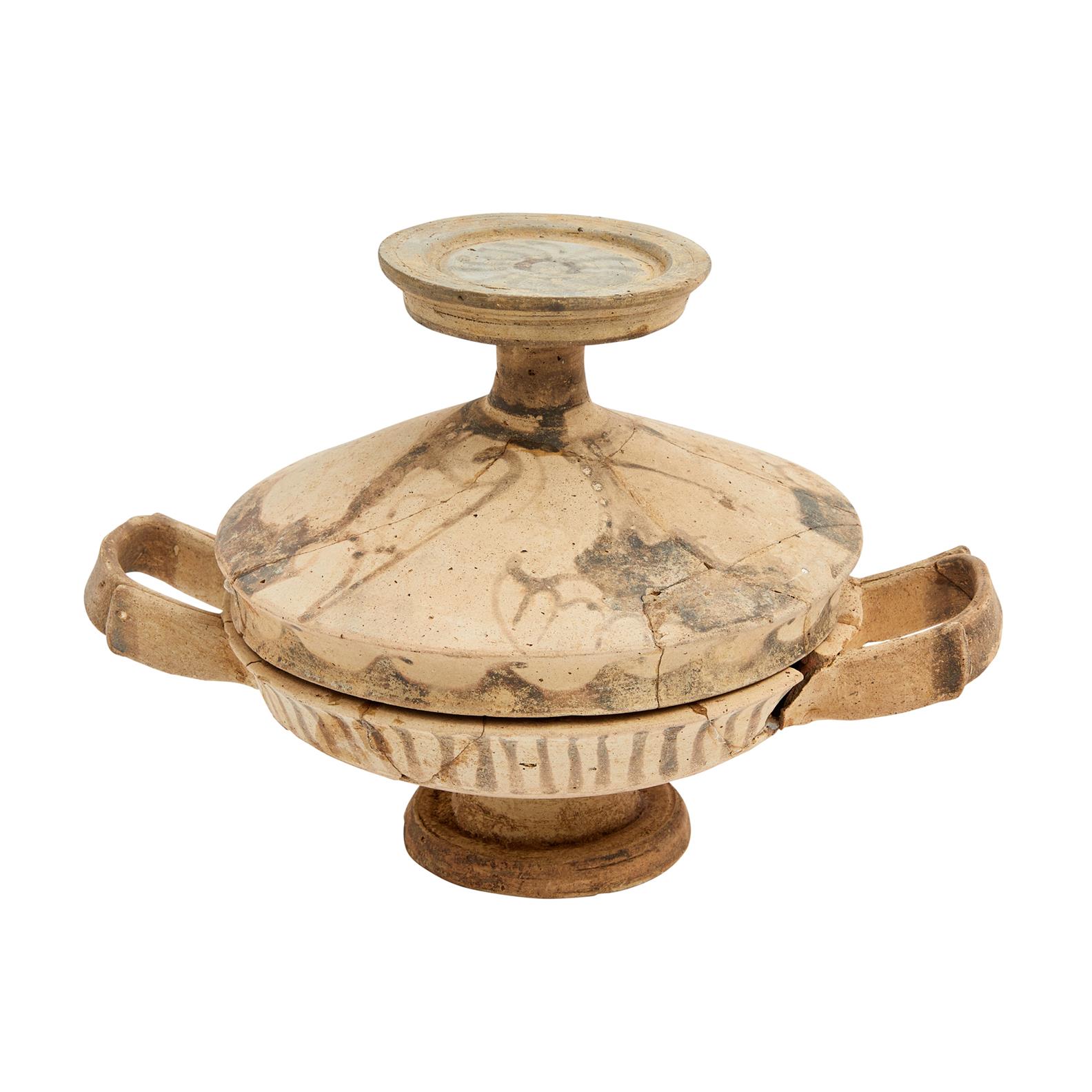 Repaired and broken, the cover glued together with sections missing to rim; base similar with mising sections to rim and near handle.
