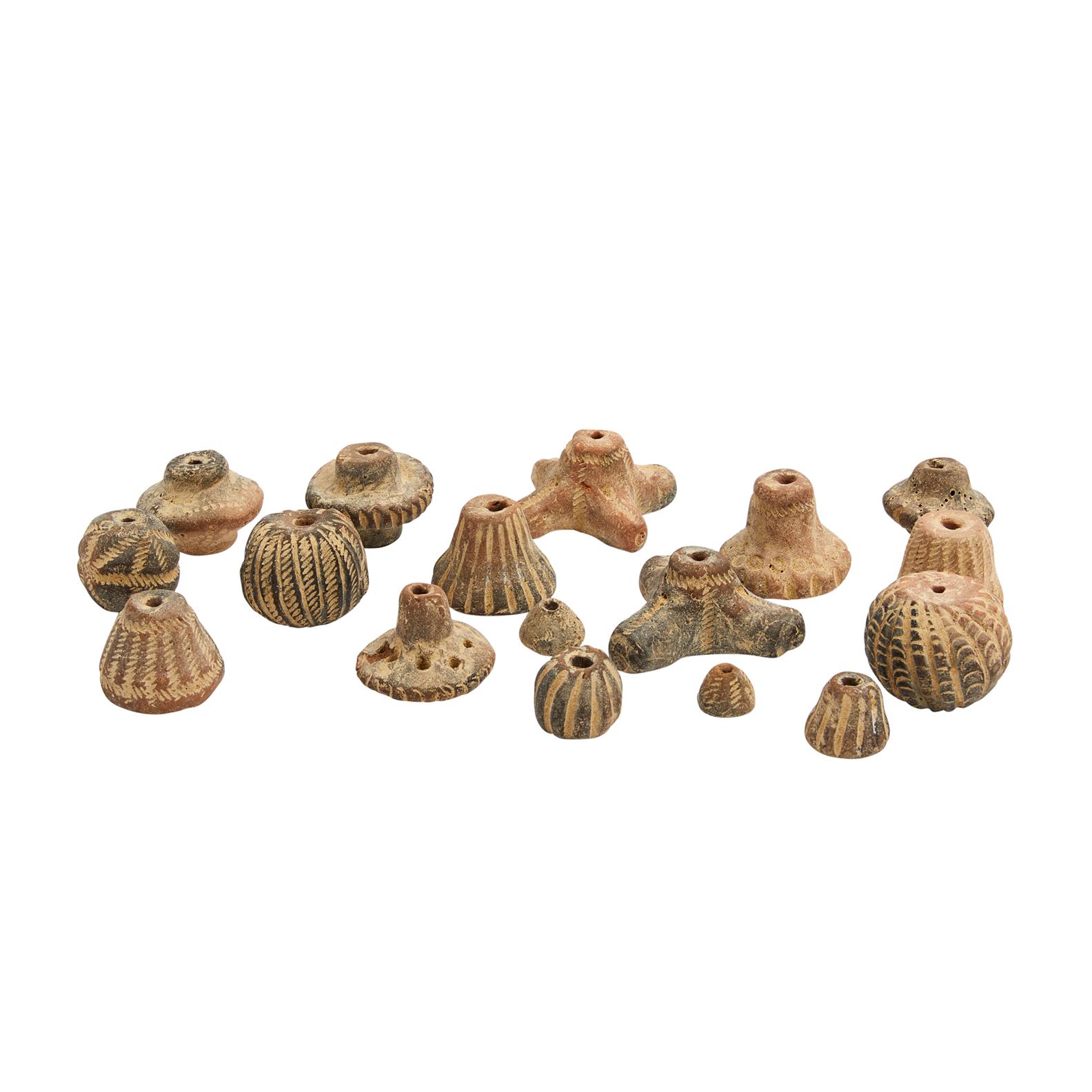 A GROUP OF SEVENTEEN ANCIENT TERRACOTTA SPINDLE WHORLS
