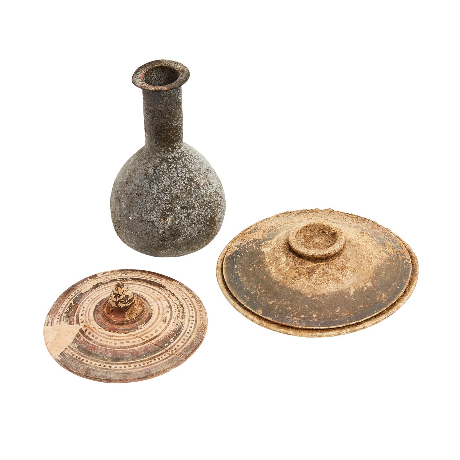 A MIDDLE EASTERN TERRACOTTA BOTTLE AND TWO ANCIENT TERRACOTTA COVERS