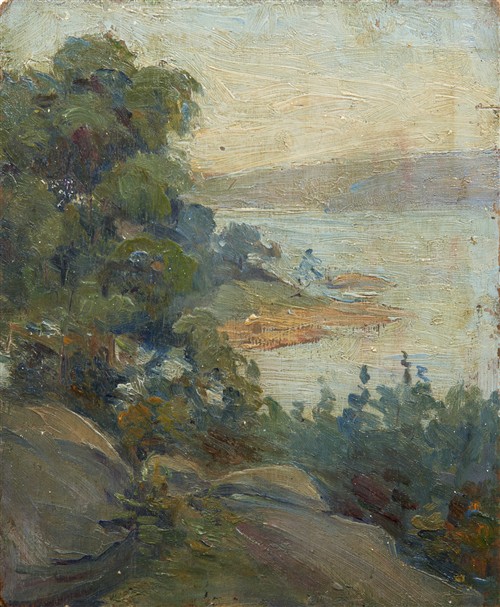 VIDA LAHEY (1882-1968) Brisbane to Southbank c.1930 oil on plywood 24.5 x 29.5cm