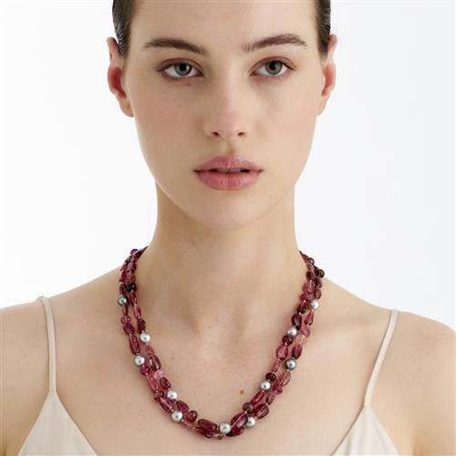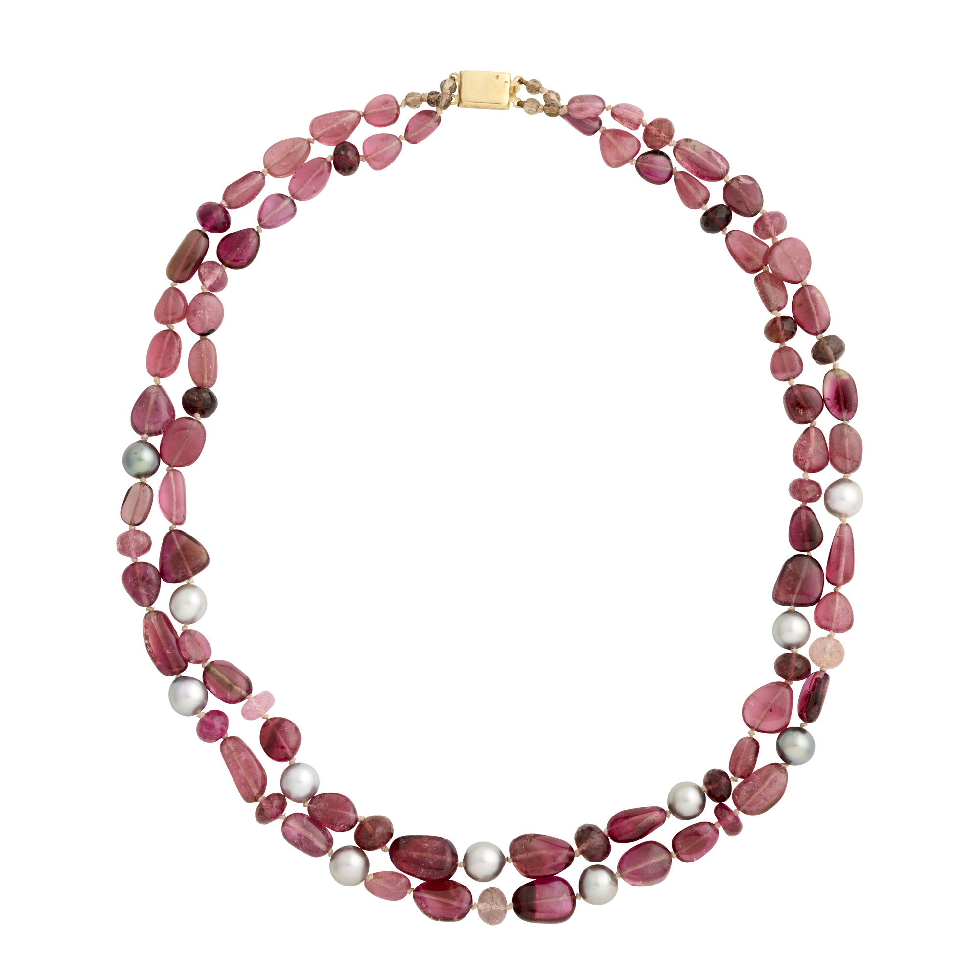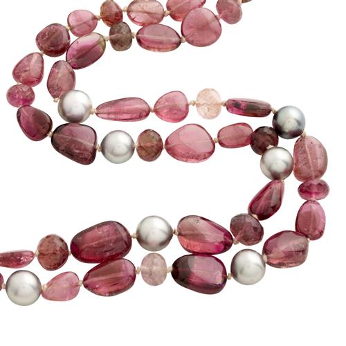 Composed of a double strand of tumbled and faceted tourmaline, spaced at intervals with pearls of light and mid-grey hues measuring approximately 8.00mm, completed by a box clasp, signed JKa for J. Köhle GmbH & Co., length 535mm.