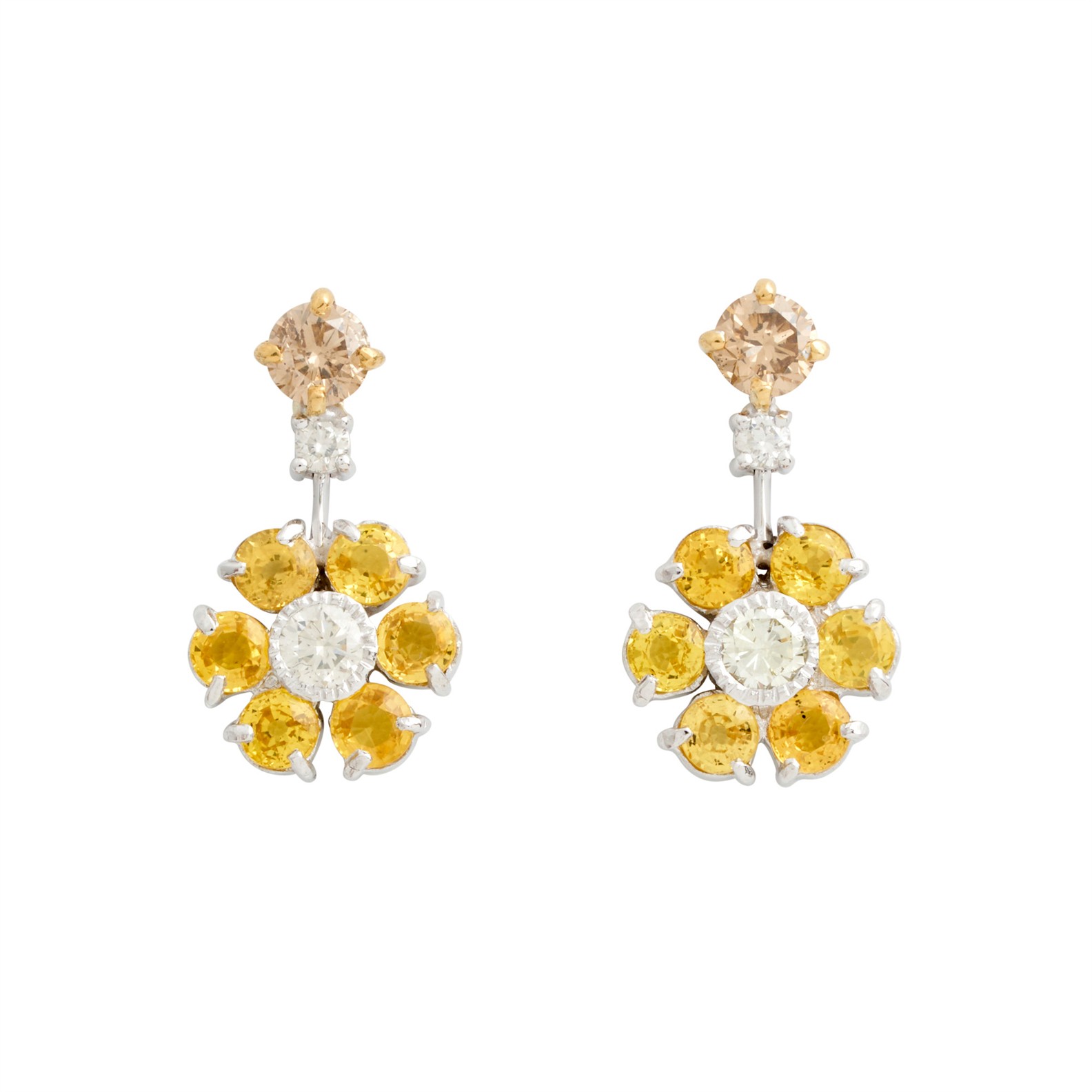 In our opinion, the sapphires are of yellow hue of strong saturation, with some typical inclusions. The diamonds are bright and lively probably of G-H colour and SI clarity as gauged and graded within the limitations of the cutting style and the mounting. The mounting has wear to the metal in the form of minor scratches.