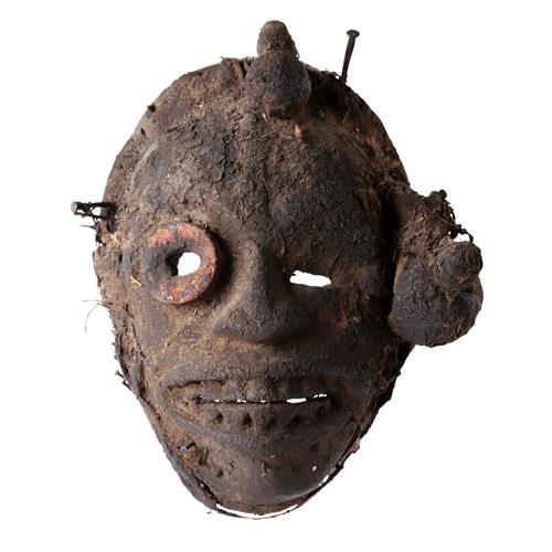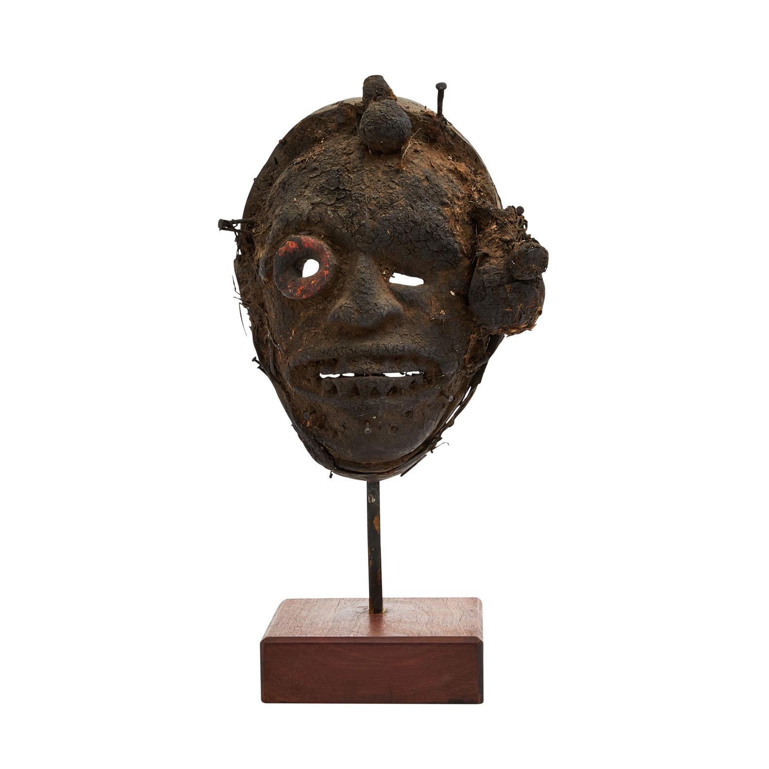 Powerfully constructed of wood with fetish attachments including magic items, the whole with a dark encrusted patina.