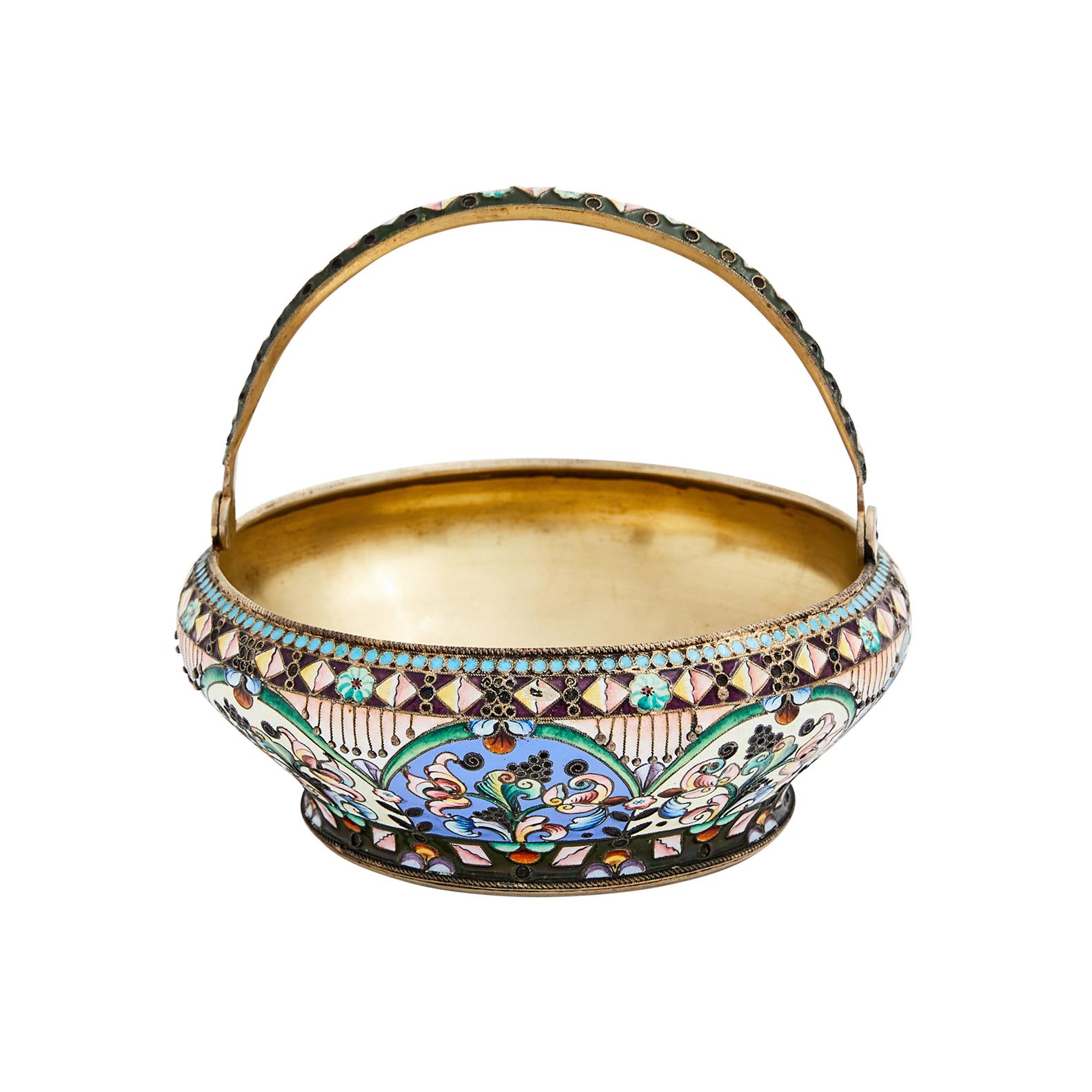 Moscow 1908-1926, maker's mark GS in Cyrillic, circular with tapering sides decorated with arched reserves of flowers, swing handle.