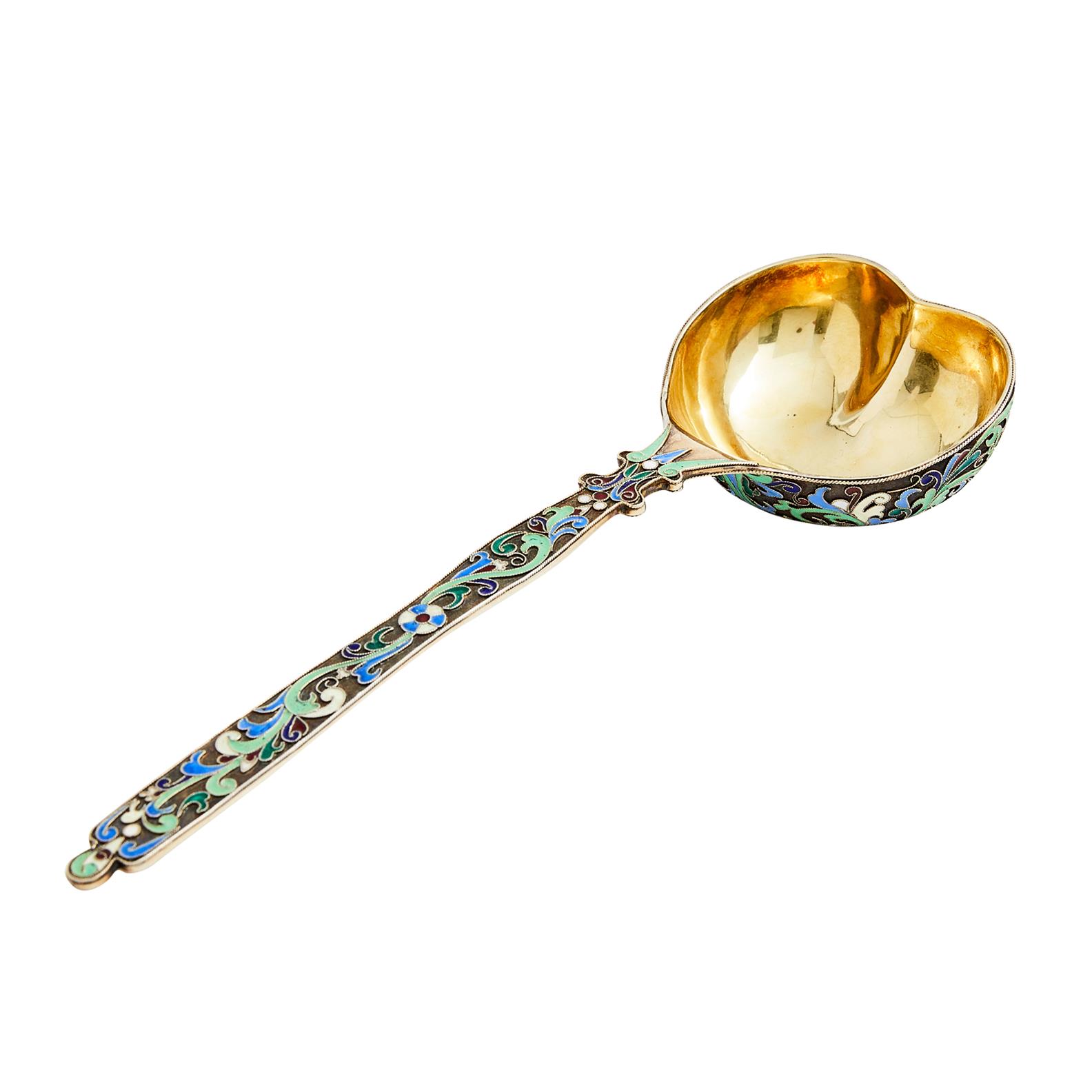 Moscow 1908-1926, 88 standard, maker's mark GS in Cyrillic, with deep bilobate bowl decorated to the outside and handle with scrolls and geometric motifs.