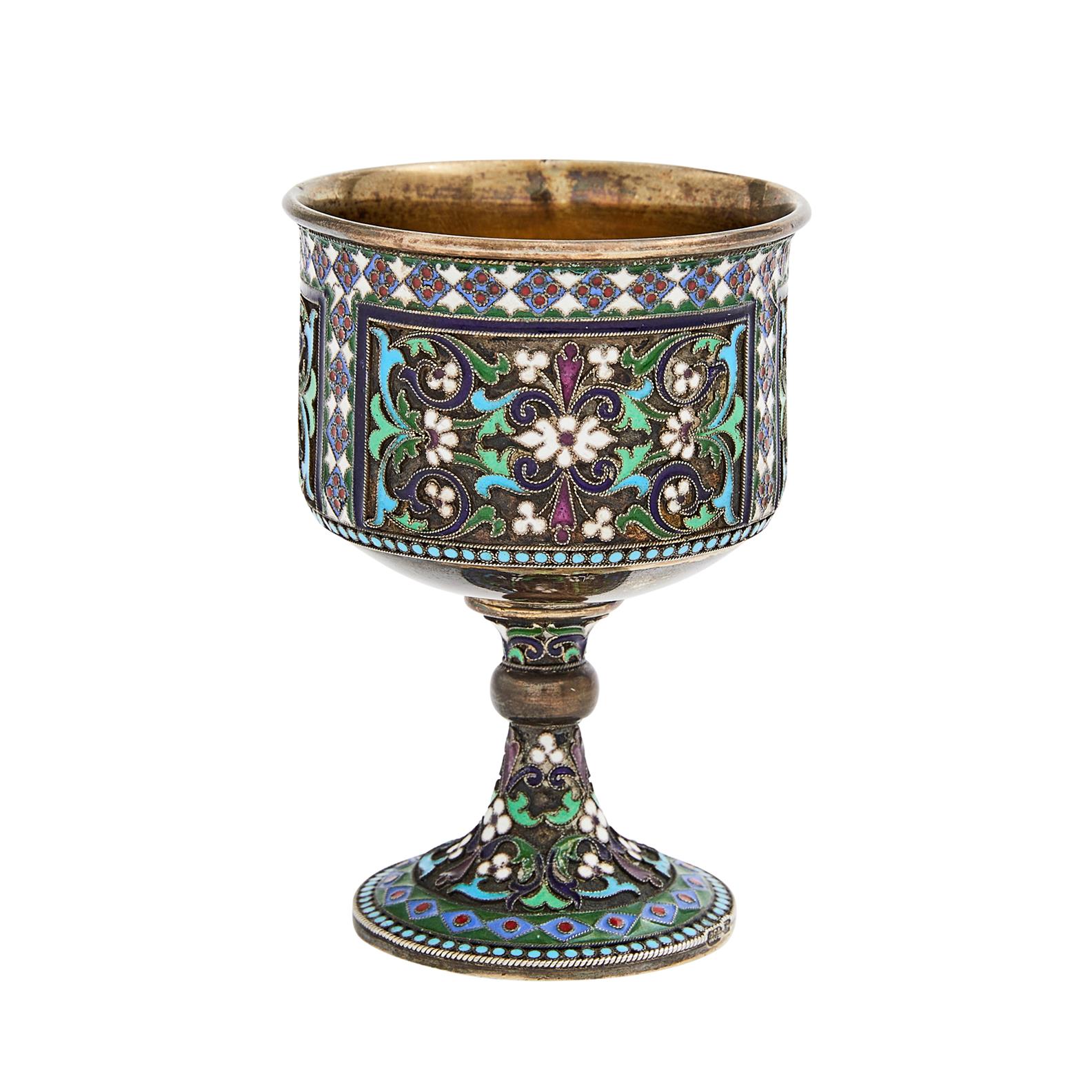 Mark of the Third Artel, St Petersburg 1908-17, the cylindrical bowl with panels of scrolls and flowers, on a knopped stem and spreading foot.